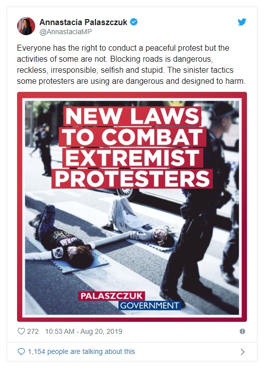 Queensland premier Annastacia Palaszczuk last month used social media to denounce the “sinister” tactics of “stupid” protesters. She claims the current XR protests are “absolutely ridiculous” and are endangering people’s lives.