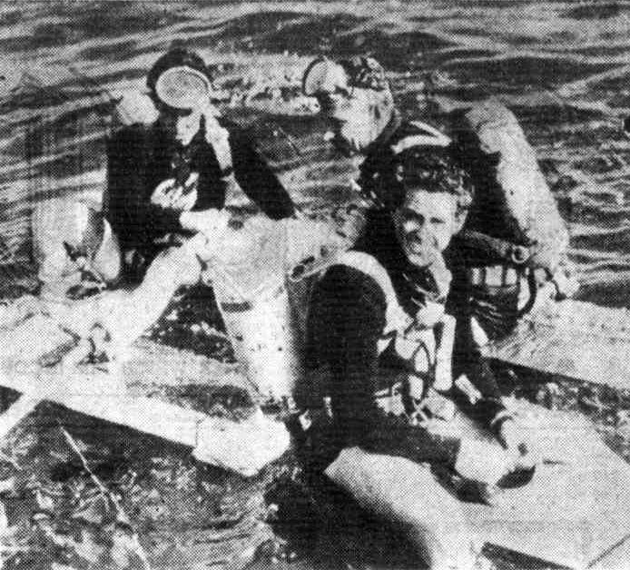 The record-breaking divers, with their equipment, on a raft in Sydney Harbor. They are (from left) Bob Brown, Dave Rawling and Ron Harding. Three Dance On Harbor Bed After 200 Ft Dive (1954, April 15). Chronicle (Adelaide, SA : 1895 - 1954), , p. 2. Retrieved from http://nla.gov.au/nla.news-article93946961