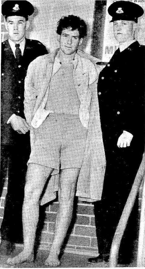 DETECTIVES escort fugitive gunman Robert Michael Brown, 20, to a waiting police car after his capture yesterday. — RADIOPHOTO. "DONT SHOOT": GUNMAN'S PLEA TO POLICE AT CAPTURE (1954, October 17).Sunday Mail (Brisbane) (Qld. : 1926 - 1954), p. 1. Retrieved from http://nla.gov.au/nla.news-article101726653