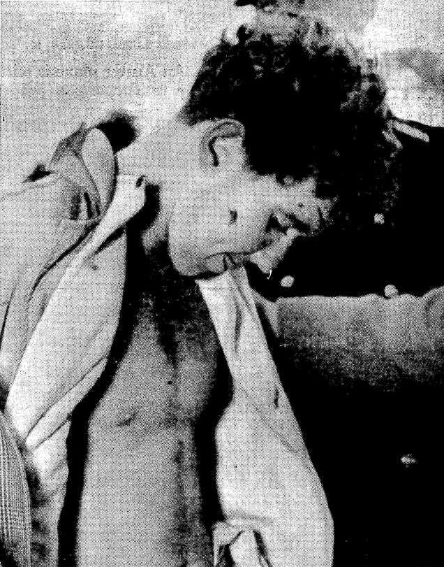 An anonymous phone caller told police: "Brown is at Newport on Bushrangers' Hill. He has just gone into a house. I think the house is unoccupied." About 20 police cars, police trucks, and motor cycle police gathered at the foot of the hill, and the hunt began. A shout went up when Brown was sighted by police about 300 yards from a house. Brown, who was wearing a light sweatshirt, shorts, and gaberdine overcoat, was barefooted when police caught him. He showed only one visible sign of injury — a deep scratch on the left side of the face. He looked a picture of misery when police handcuffed him and marched him back to the main road, where scores of police had been posted. His shoulders sagged, and he was limping. His eyes were bloodshot, and he had a stubble of beard on his chin.
