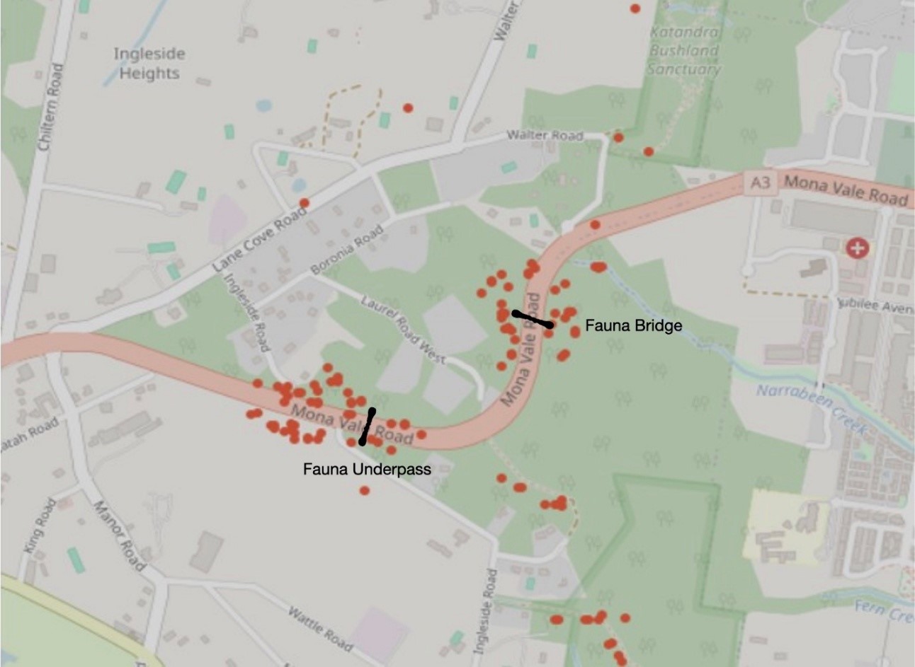 The crossings, a fauna overpass and underpass on Mona Vale Road, connect bushland in Ku-ring-gai Chase National Park and Katandra Wildlife Sanctuary to Ingleside Chase Reserve.