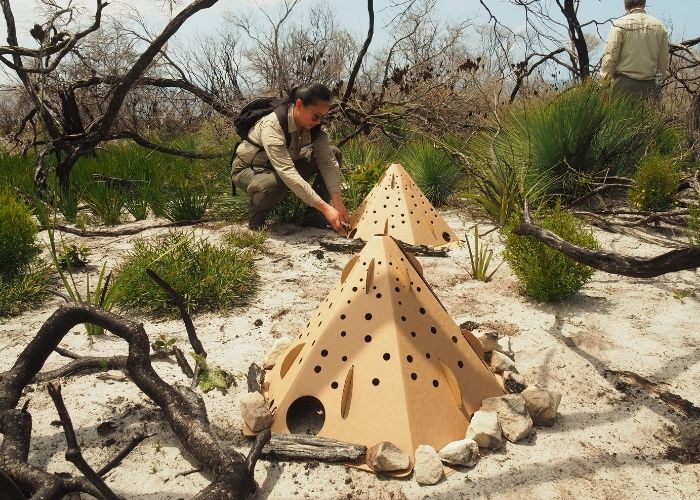 Raña’s project will now investigate the effectiveness of the habitat pods. Two hundred of the cardboard shelters are being deployed across parts of the headland that were impacted by the fire, for an experiment that will run for up to 12 months. It is hoped they will offer small animals short-term refuge from the elements and a place to hide from predators like feral cats, which have been shown to take advantage of easier hunting conditions post-fire.