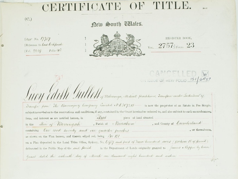 Lots 82 and 83 and part of Lot 93, along with Lot 94 were purchased by Harry and Edith Lucy Wolstenholme with the Title registered on August 26th, 1915. Harry was a son of Maybanke Anderson, and a keen birdwatcher, hosting members of the Royal Zoological Society of New South Wales at this Palm Beach residence, and had visitors such as Ella McFadyen. The couple were also part of the group that formed the Barrenjoey Land Company, with the original deed of transfer for all those lands at Palm and Whale Beach registered in Edith's name.