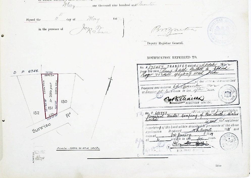 Wife of James Robson-Scott, Charlotte, had bought Lot 29, with the Title registered in February 1914. The 'pretty little bungalow' at current day 30 Sunrise Road was apparently purchased by James Robson Scott, paying £300 according to some records, from the Barrenjoey Land Company, on corner of Palm Beach Road and Pacific roads, opposite what would become stone Maitland home.