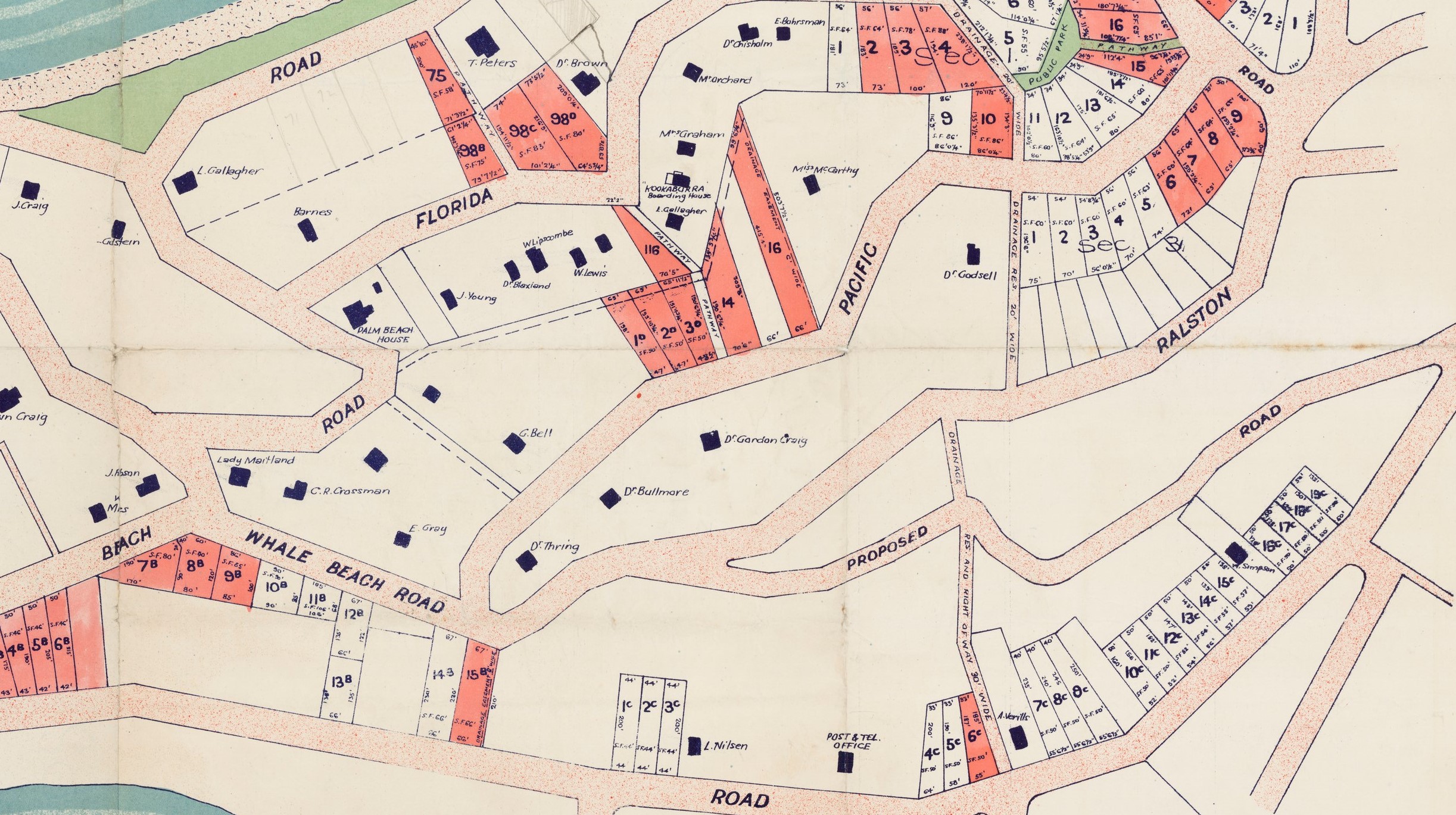 Lots 87 and 88, then right at the end of Ocean Road, were first bought by a Gustavus Athol Waterhouse on July 3rd 1913 and then transferred to Alfred James Hordern on December 22nd, 1919.