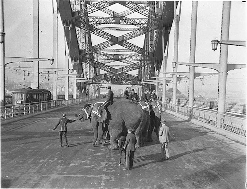 Six Wirths’ Circus elephants with their attendants and a Shetland pony cross the Sydney Harbour Bridge as part of a publicity stunt in 1932. Wikimedia Commons