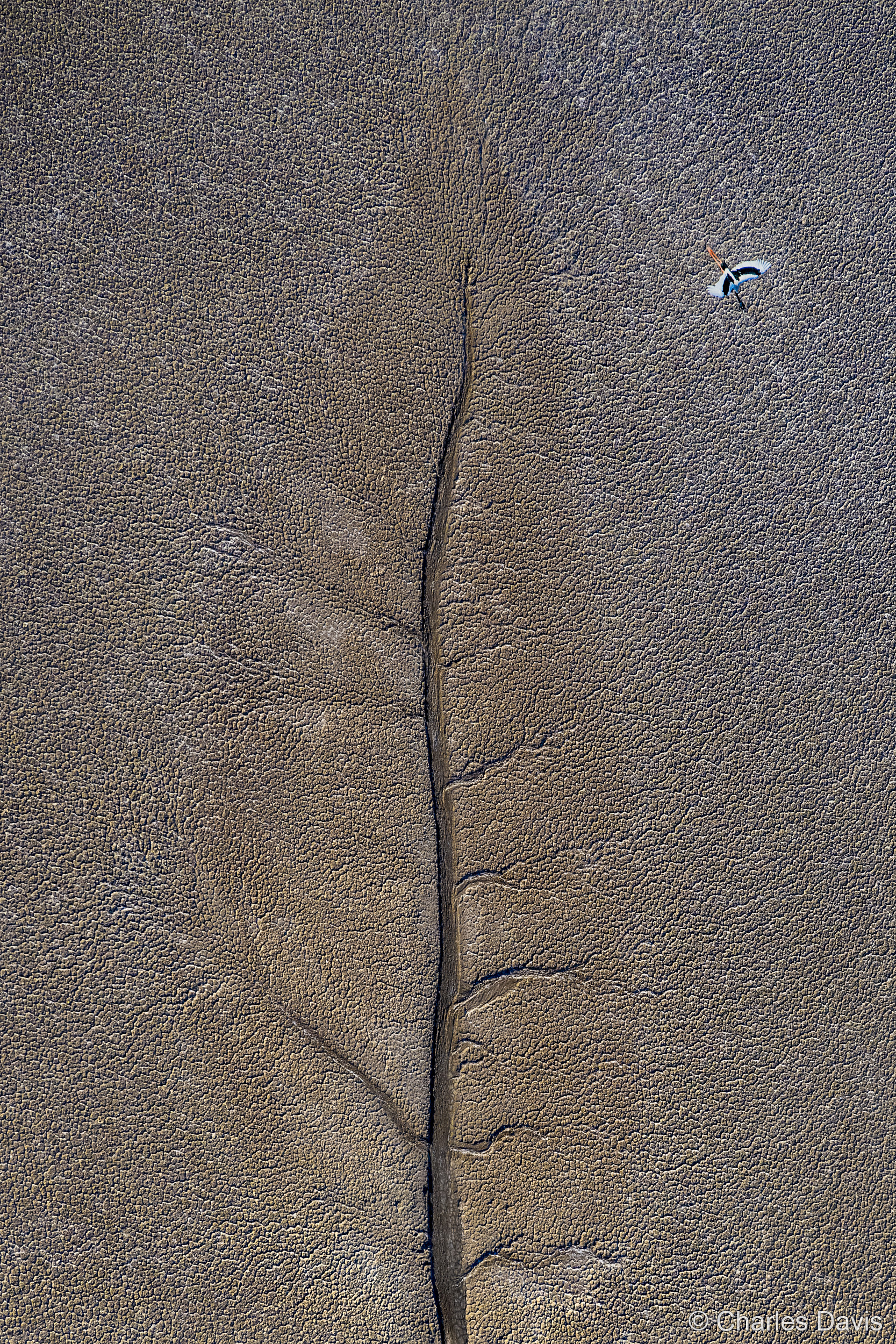 Aerial: Jabiru Leaf by Charles Davis (NSW)—Black-necked stork soaring over tidal flats patterned like leaf veins, revealing wetland ecosystems.