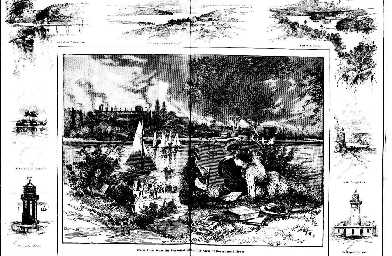 The same may be said of the central portion of our double-page sheet of illustrations - Farm Cove - a spot full of old reminiscences, which we refrain from refer- ring to now, in order to avoid repetition when the course of our article brings us round to Sydney Cove, and this adjacent bay.