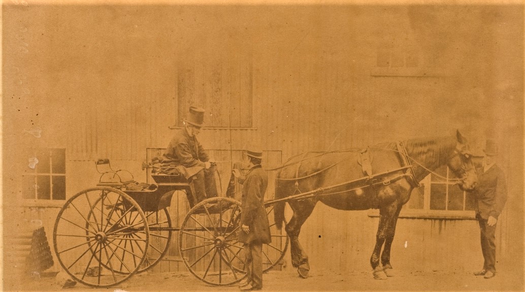 Manly Beach, circa 1870s - Beach Steamer timetable and rail tracks for goods. Signs in the background read “The Pier Family Hotel” and “Ivanhoe Park Hotel and picnic grounds.” - From the Collection of the Josef Lebovic Gallery, Kensington, Sydney