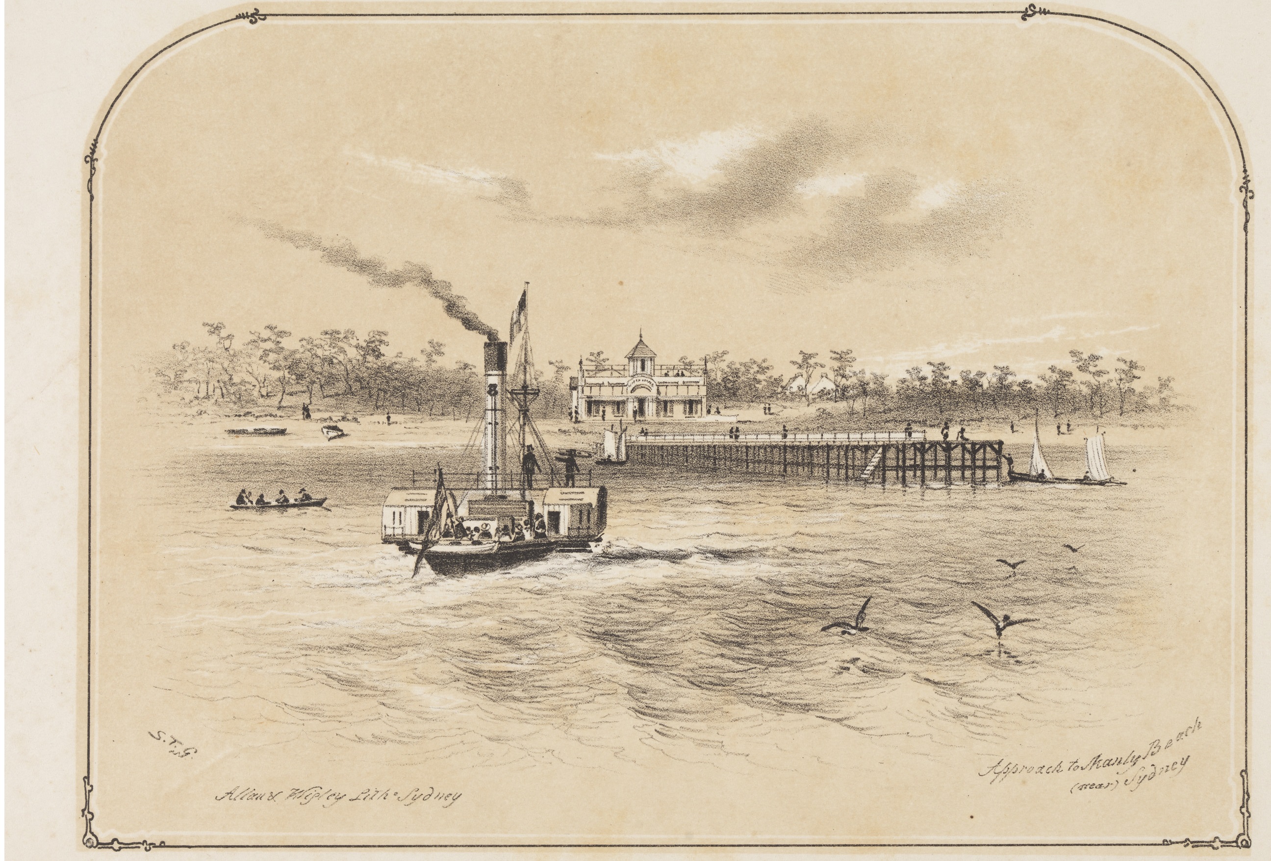 Manly [a view from the beach including pier and steam ferry], [1854-1872] / Samuel Thomas Gill, Item: c066540001, courtesy Dixson Library, State Library of New South Wales