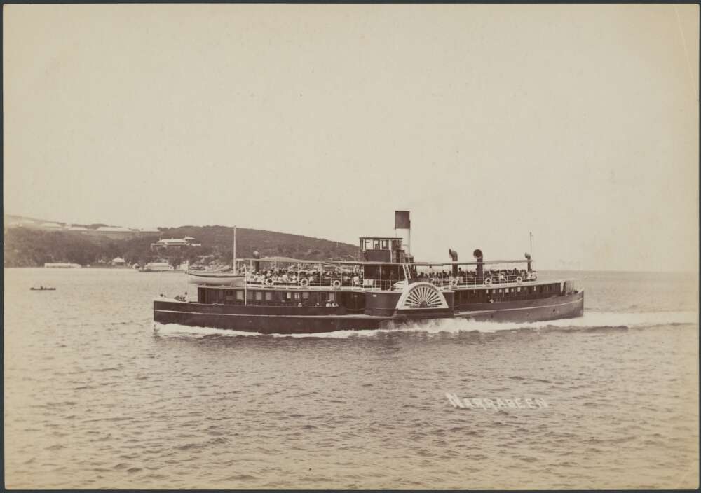 Narrabeen, Passing Garden Island with her original open wheelhouse - photo by Henry King. circa 1886-1899, courtesy MAAS, https://collection.maas.museum/object/31388