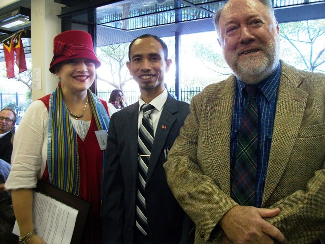 Above: Tamara Sloper Harding, Chair of the Pittwater Friends of Soibada, Consul Fonseca Dos Santos Pereira of the Consulate-General of the Democratic Republic of Timor-Leste in Sydney and Councillor Harvey Rose, Mayor of Pittwater at Maria Regina Catholic School, Avalon in 2012