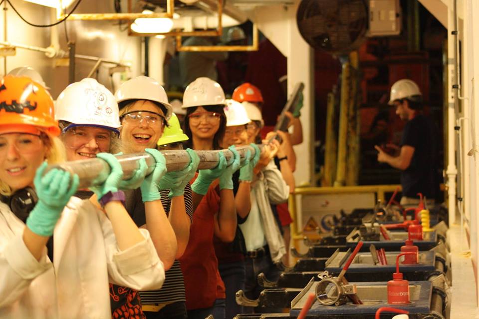 Example: Sarah Kachovich - Deep sea drilling in the Indian Ocean to understand how and why big earthquakes happen. This photo is of the last core of our expedition. Photo credit Tim Fulton