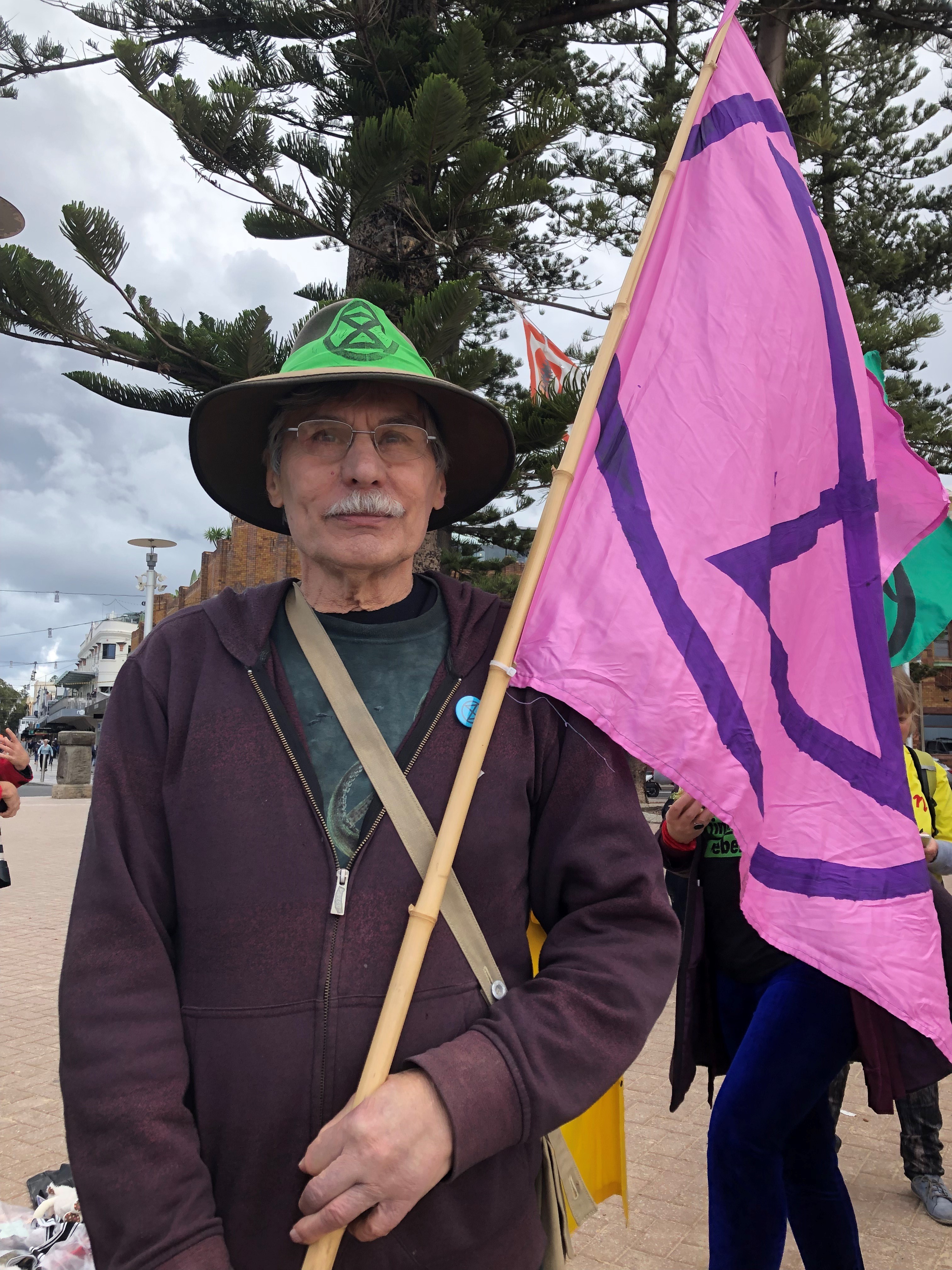 One of the demonstrators at Friday’s XR protest in Manly was bio-diversity lecturer Martin Wolterding, 75, who was arrested at another protest earlier in the week. Police dragged Mr Wolterding off Parramatta Road at the earlier environmental demonstration.