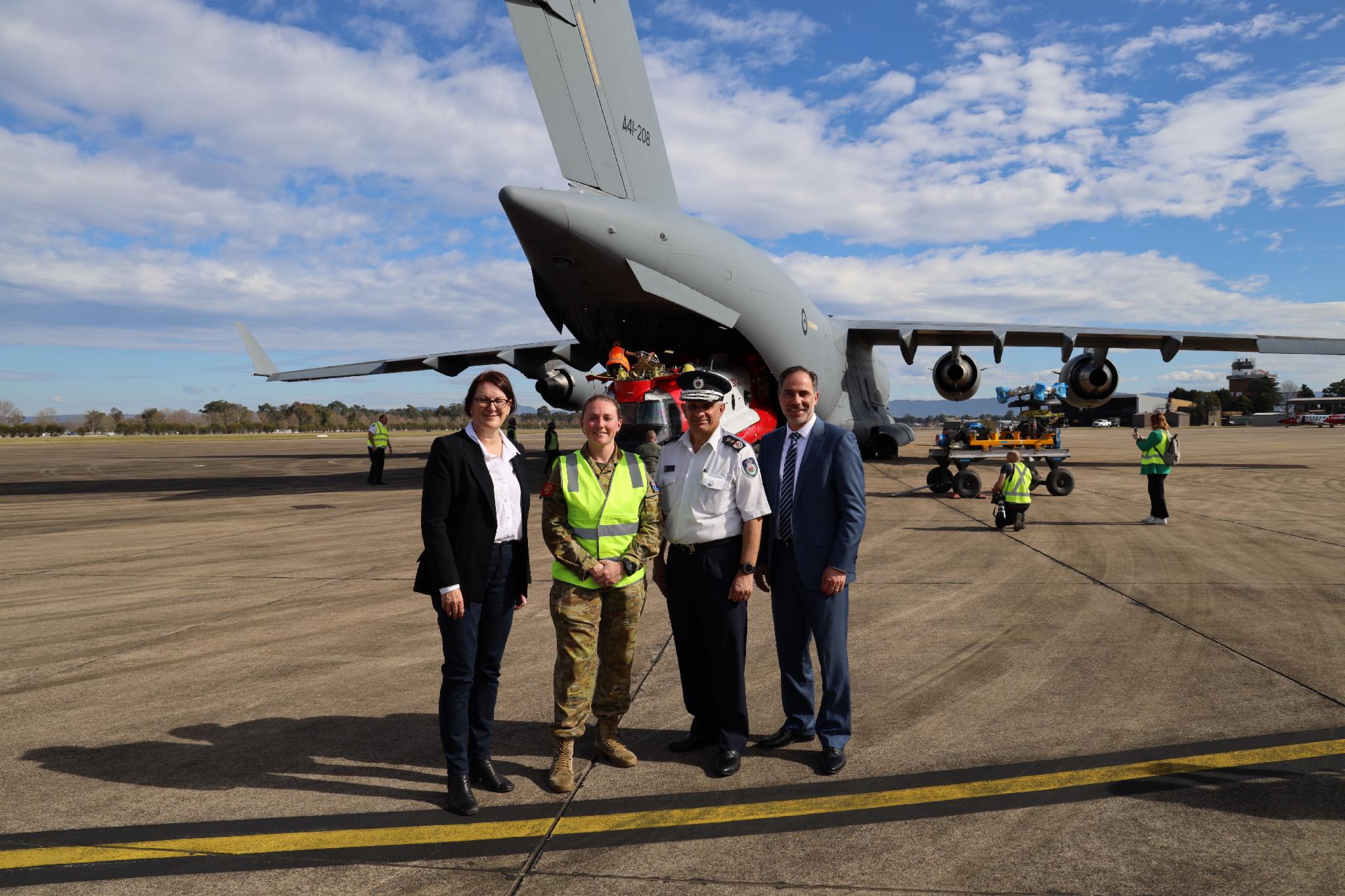 Minister for Emergency Services Jihad Dib was joined by Commonwealth Member for Macquarie Susan Templeman and Commissioner of the RFS Rob Rogers, to welcome the CH-47 Chinook at RAAF Base Richmond.