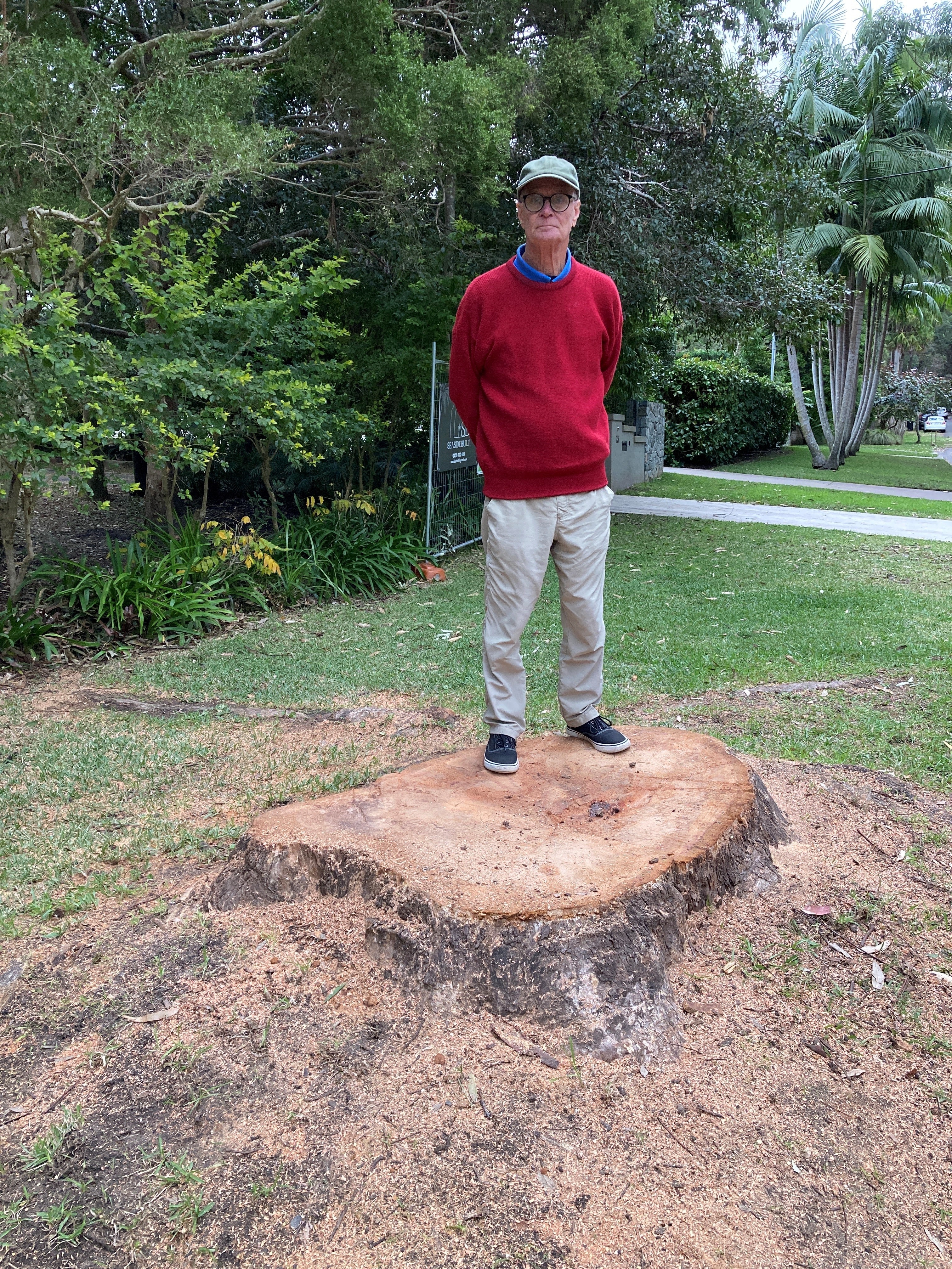 David Palmer on Tree stump of one of the trees destroyed by Northern Beaches Council