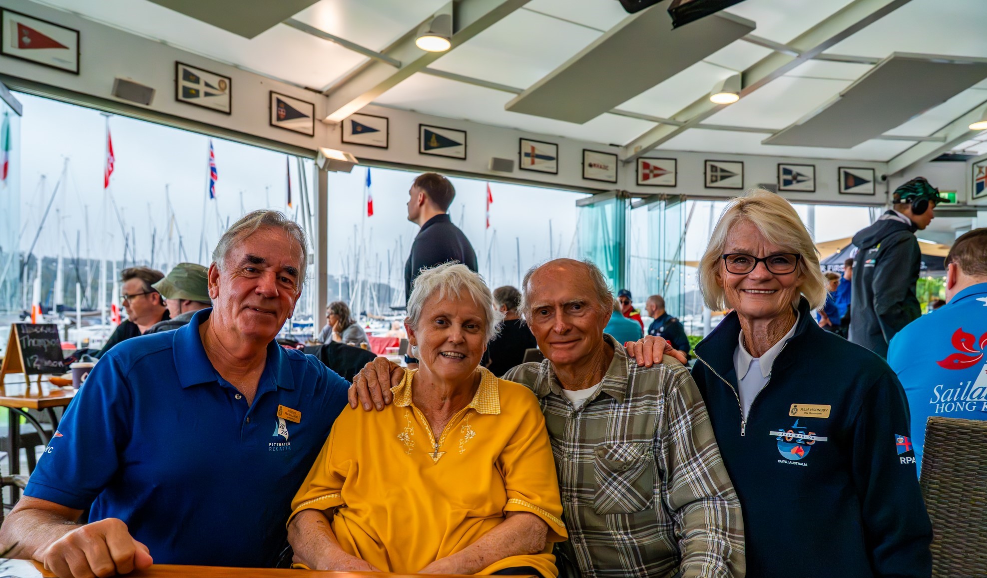 RPAYC Commodore Rob McClelland, Hansas Jackie Kay and Chris Mitchell and RPAYC Vice Commodore, Julia Hornsby. Photo: Alex Dare, Hansa Worlds 2025, hosted by Royal Prince Alfred Yacht Club, Newport, and held on Pittwater