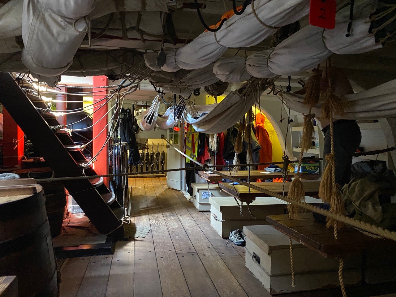 ''This is what’s called the ‘18th century deck’ and is as good as a remake of Cook’s original mess and sleeping deck as possible - my hammock is one of those up to the right.'':