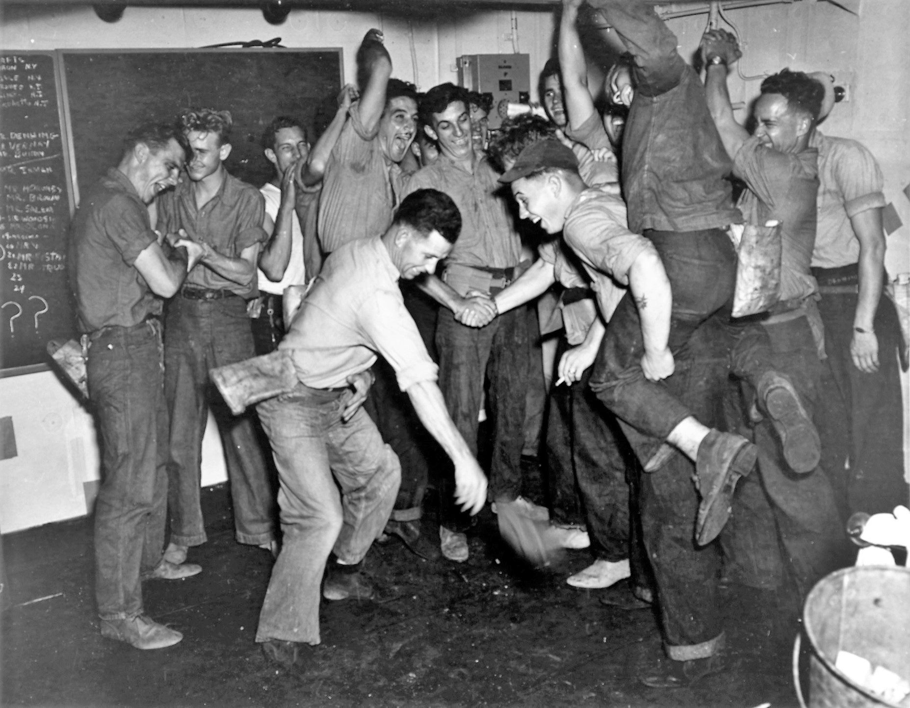 Surrender of Japan, 1945. Description: USS Bougainville (CVE-100) crewmen celebrate after listening to the announcement of Japan's surrender, 14 August 1945. Their ship was then transporting aircraft to the central Pacific. Official U.S. Navy Photograph, now in the collections of the National Archives. Catalog #: 80-G-377111