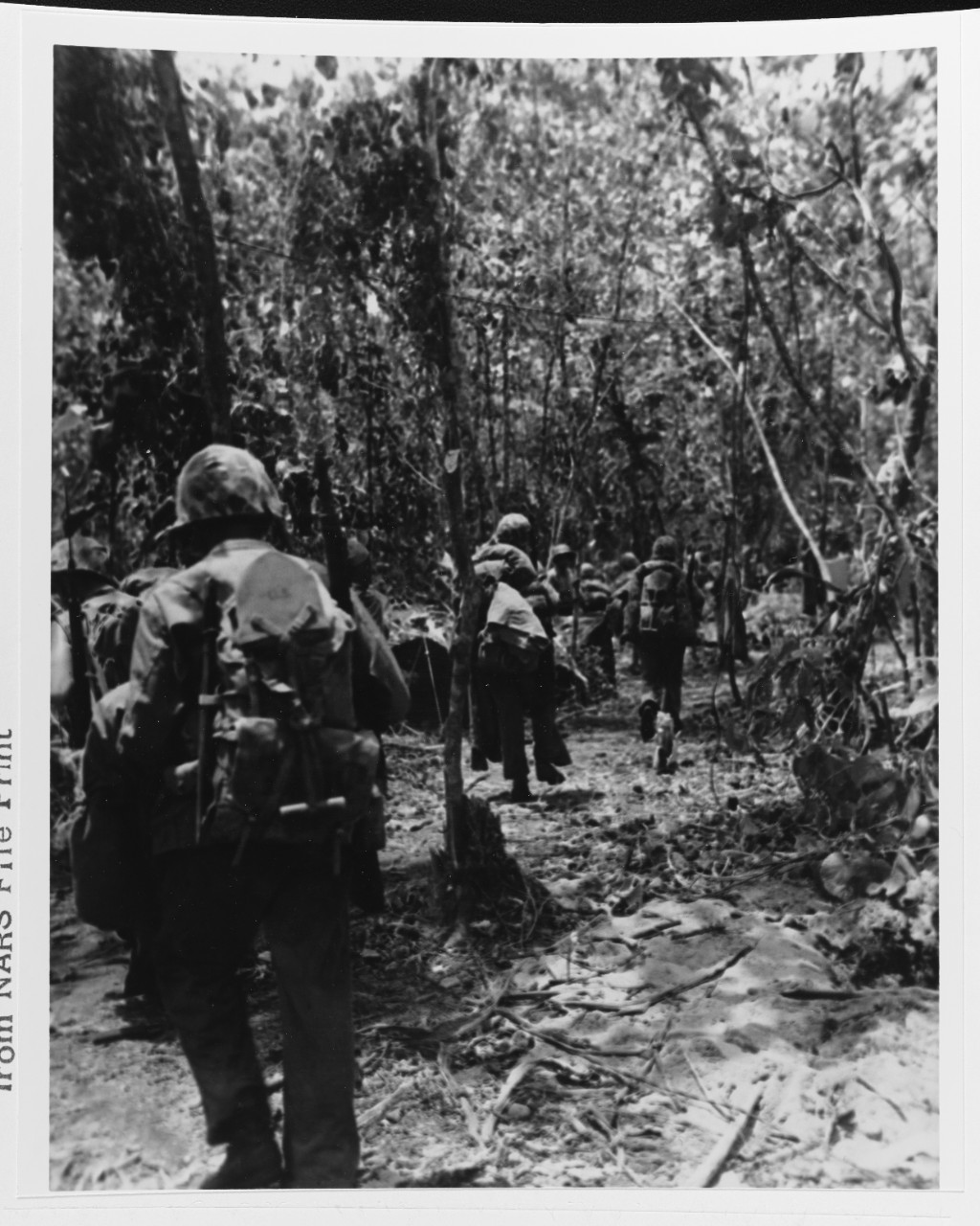 U.S. Army soldiers on Bougainville (one of the Solomon Islands) in World War II. Japanese forces tried infiltrating the U.S. lines at night; at dawn, the U.S. soldiers would clear them out. In this picture, infantrymen are advancing in the cover of an M4 Sherman tank.