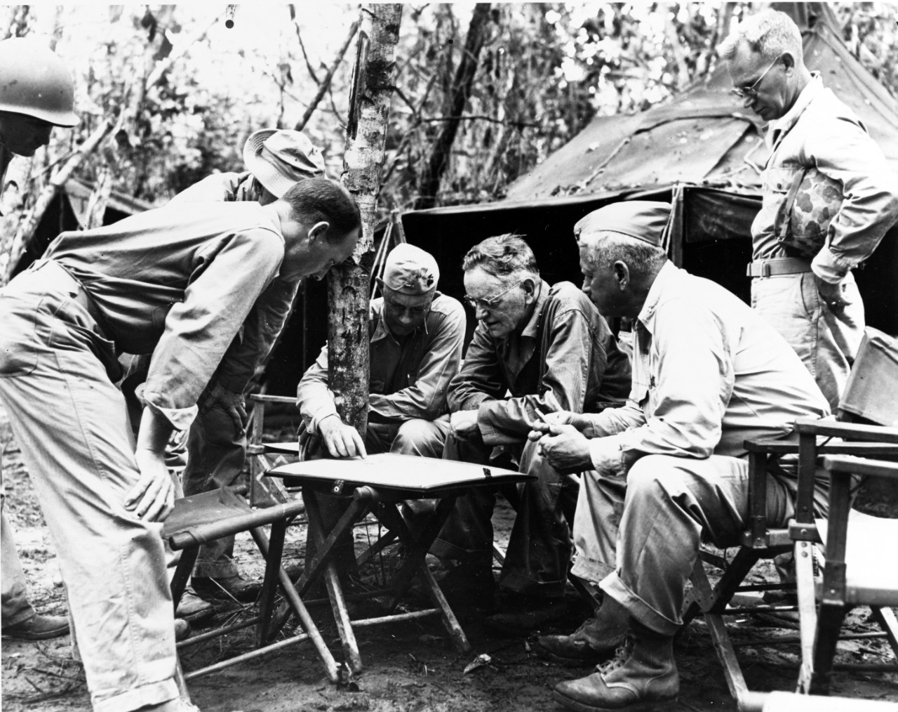 Photo: Admiral William F. Halsey, Jr., commander, South Pacific Force (seated in center, hatless) at a planning session behind the front line on Bougainville with Marine Corps Major Generals Allan H. Turnage and Roy S. Geiger, November 1943 (80-G-161595). Official U.S. Navy Photograph, now in the collections of the National Archives.