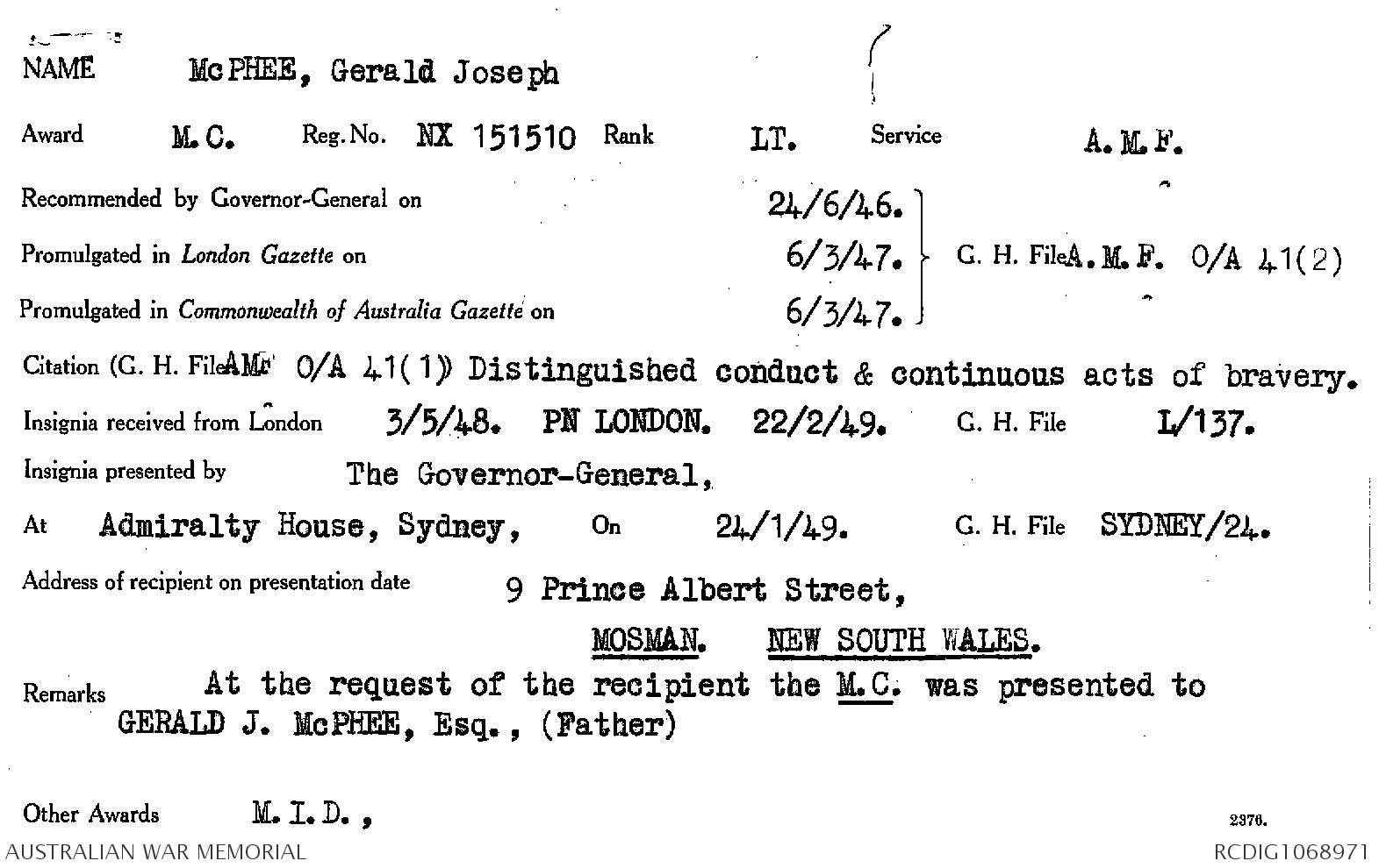 Gerald Joseph McPhee - A World War II 'M' Special Unit Member: Remembrance Day 2022 - threads collected and collated by A J Guesdon, 2022