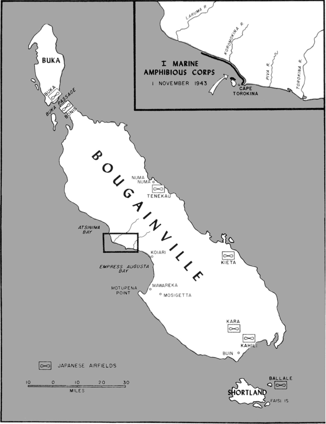 Map of Bougainville. Cape Torokina is on the western side of the island, depicted inside the box on the map. Japanese airbases are marked by the two-bladed propeller symbols.