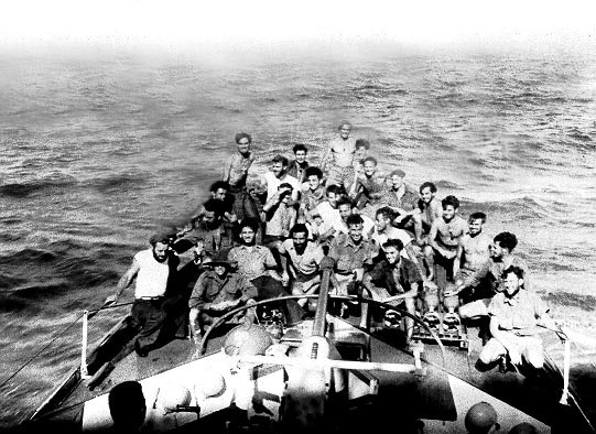 There were more POWs in the water than crew members. The POWs were holding pieces of wood and using bigger pieces as rafts. They were in groups of 20 to 30 people, probably 100 people in all. They were singing songs. I was particularly impressed when they began singing Auld Lang Syne as a tribute to their dead colleagues. Watching that, I learnt that Australians have big hearts. — Eyewitness Yoshiaki Yamaji, interviewed Oct. 2003