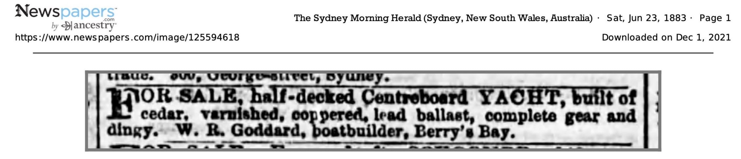 W. J. GODDARD and SONS. BUILDERS OF BOAT'S SINCE 1883. A LIFE'S Practical Experience at your service. PALM BEACH, N.S.W. Advertising. (1937, December 18). The Sydney Morning Herald(NSW : 1842 - 1954), p. 2. Retrieved from http://nla.gov.au/nla.news-article17432572