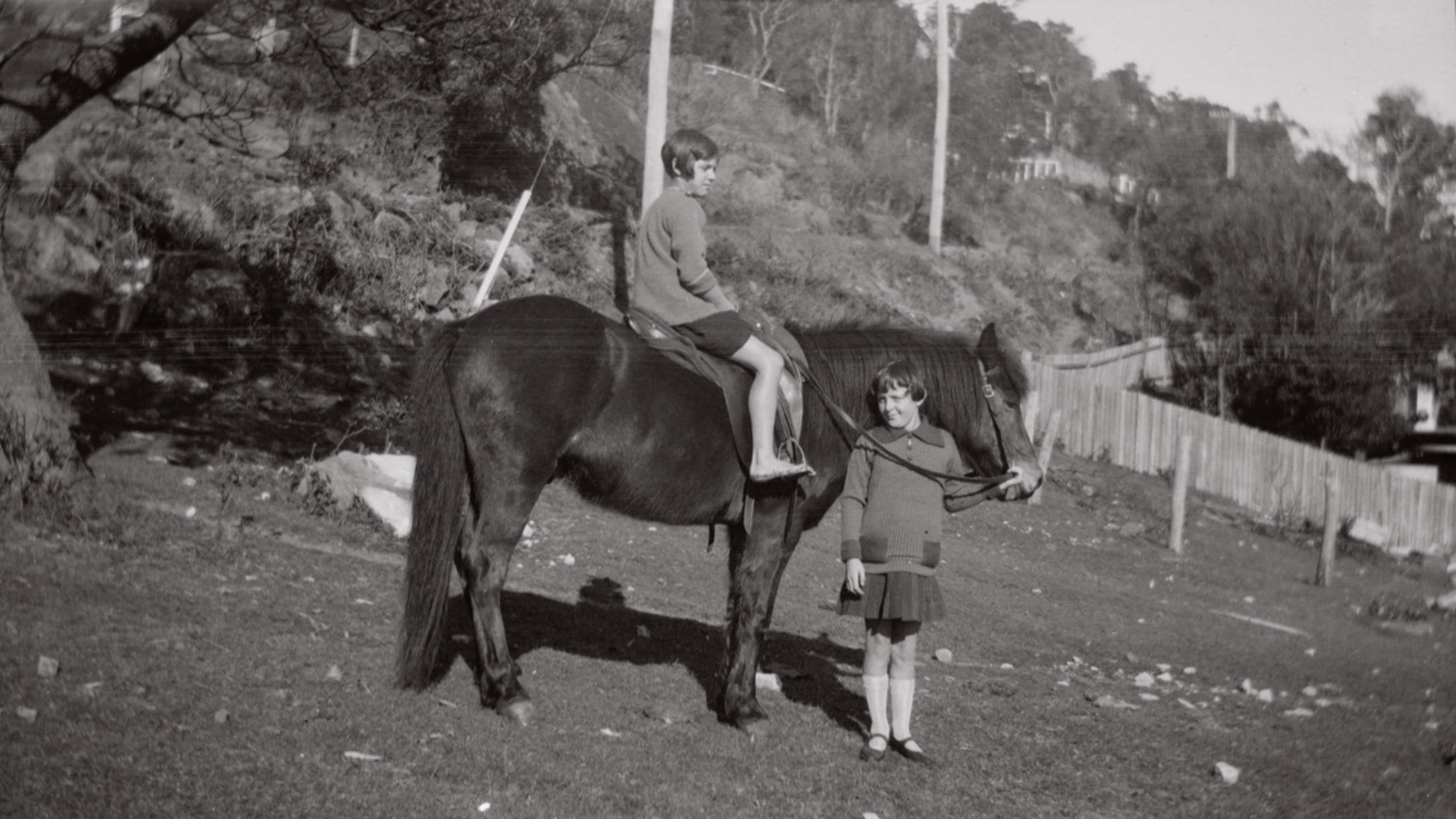 photo of Madge Gonsalves (Married Arthur Goddard) with Custard the Dog and Jack the Horse. Rendezvous Tea Rooms behind. Photo: Bill Goddard