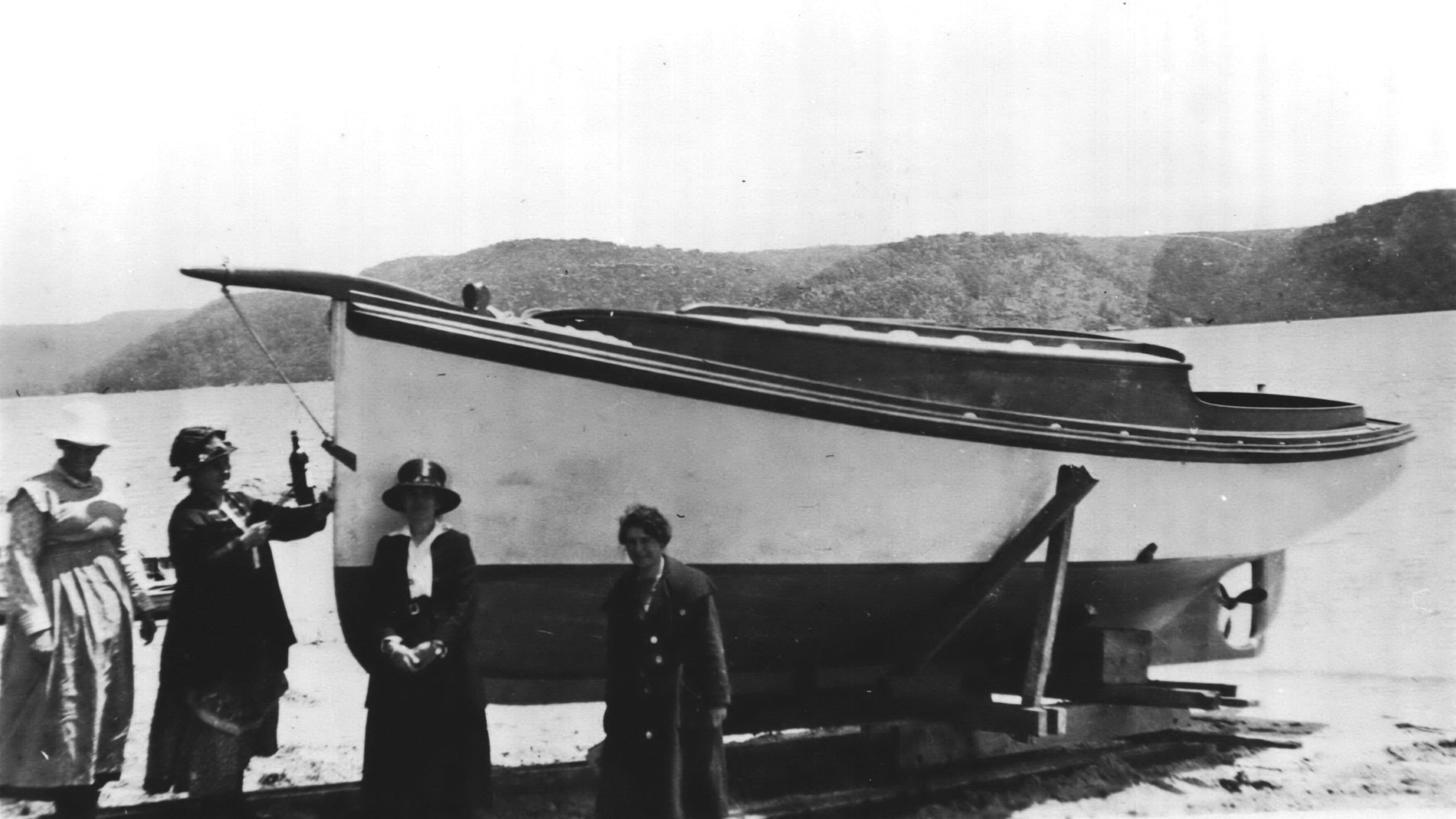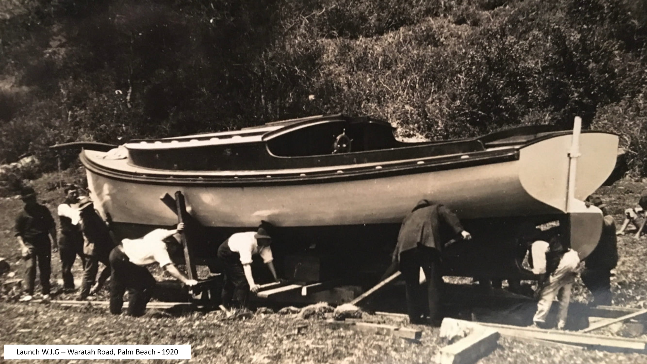 The newly completed launch ‘WJG’ being hauled to the water's edge in Waratah Road, Palm Beach - 1920. Photo: Goddard Family
