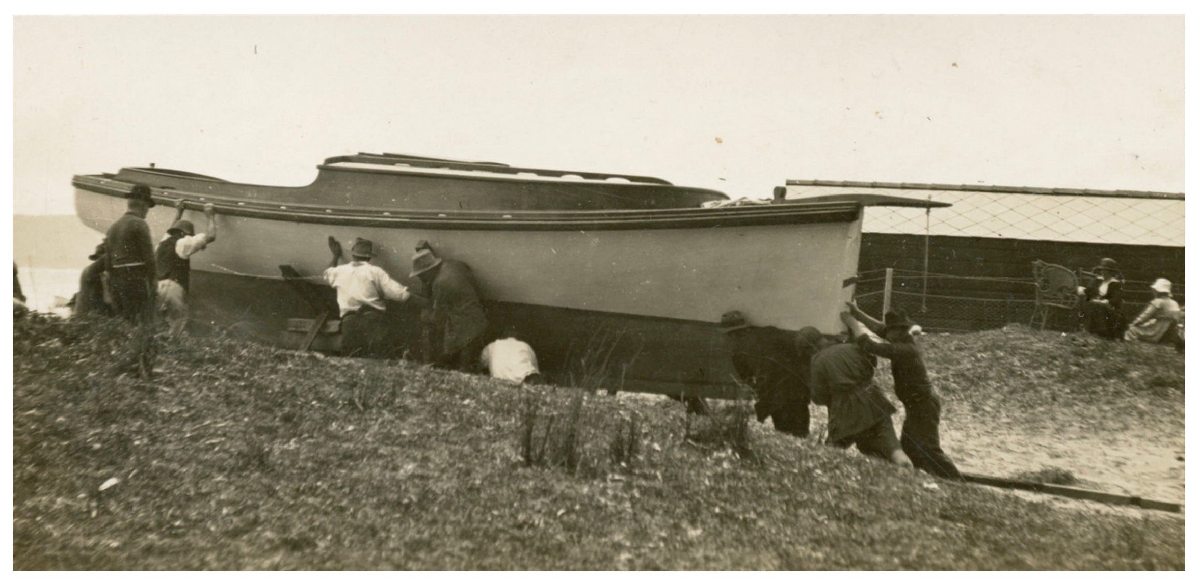 Later he erected the present sheds, where for about 20 years he was actively engaged in building skiffs and dinghies for almost every aquatic man on the north side of the harbor, and for the Royal Navy. In addition, he designed and built innumerable flood boats for the country, inland boats for trading purposes, and fishing craft in great variety.