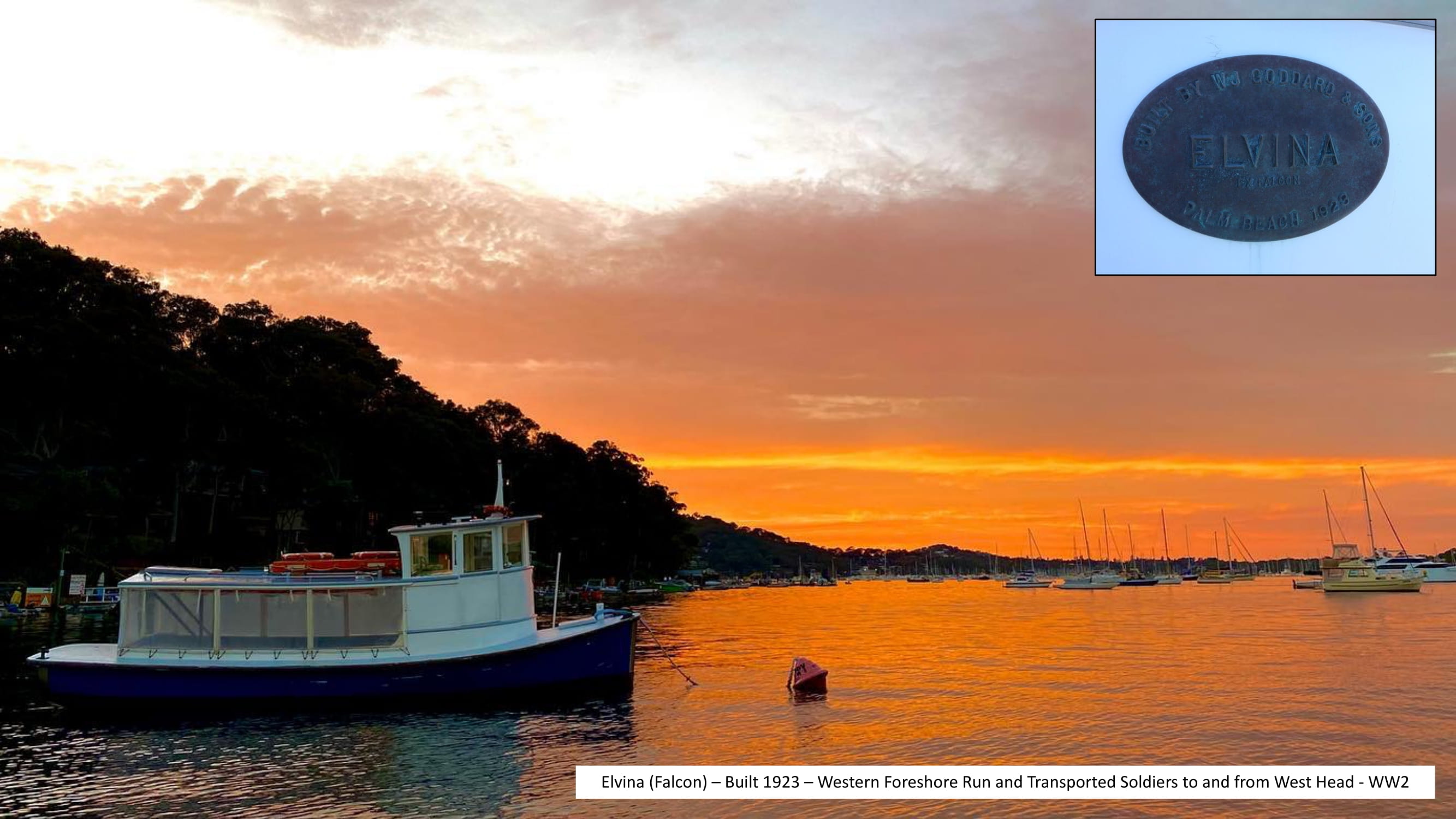 Also included was a small motor launch “Falcon” (which was later known as “Elvina”) built by William in 1928 (and later sold to the Church Point Ferry Service). “Elvina” provided a very important service to the people of Pittwater at the time, delivering supplies and mail. She is the longest serving passenger ferry in NSW and still comes out for service when needed. She is currently moored over near Lovett Bay, owned and run by the Church Point Ferry Service.