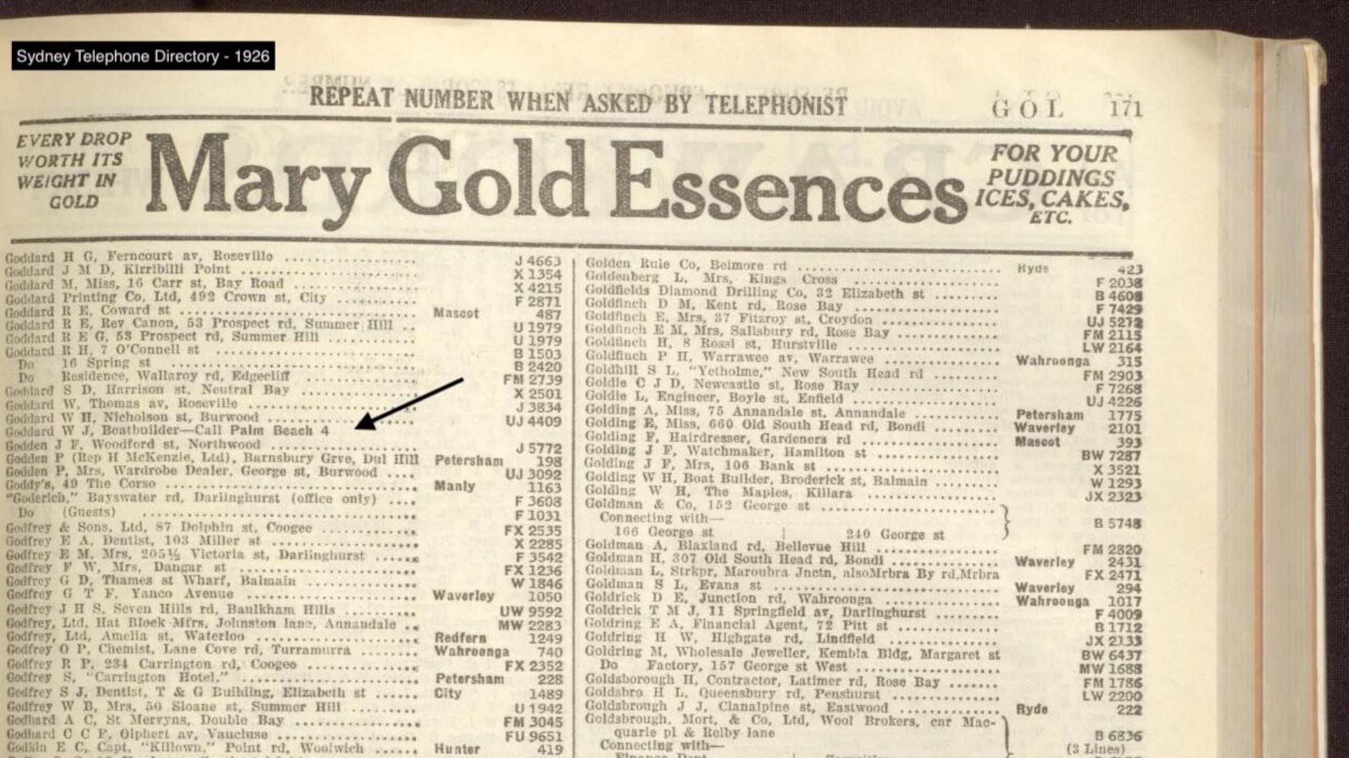 PALM BEACH -Furnished cottages to Let and For Sale. Write W. Gofddard, Palm Beach. Advertising (1917, September 8). The Sydney Morning Herald (NSW : 1842 - 1954), p. 18. Retrieved from http://nla.gov.au/nla.news-article15746700