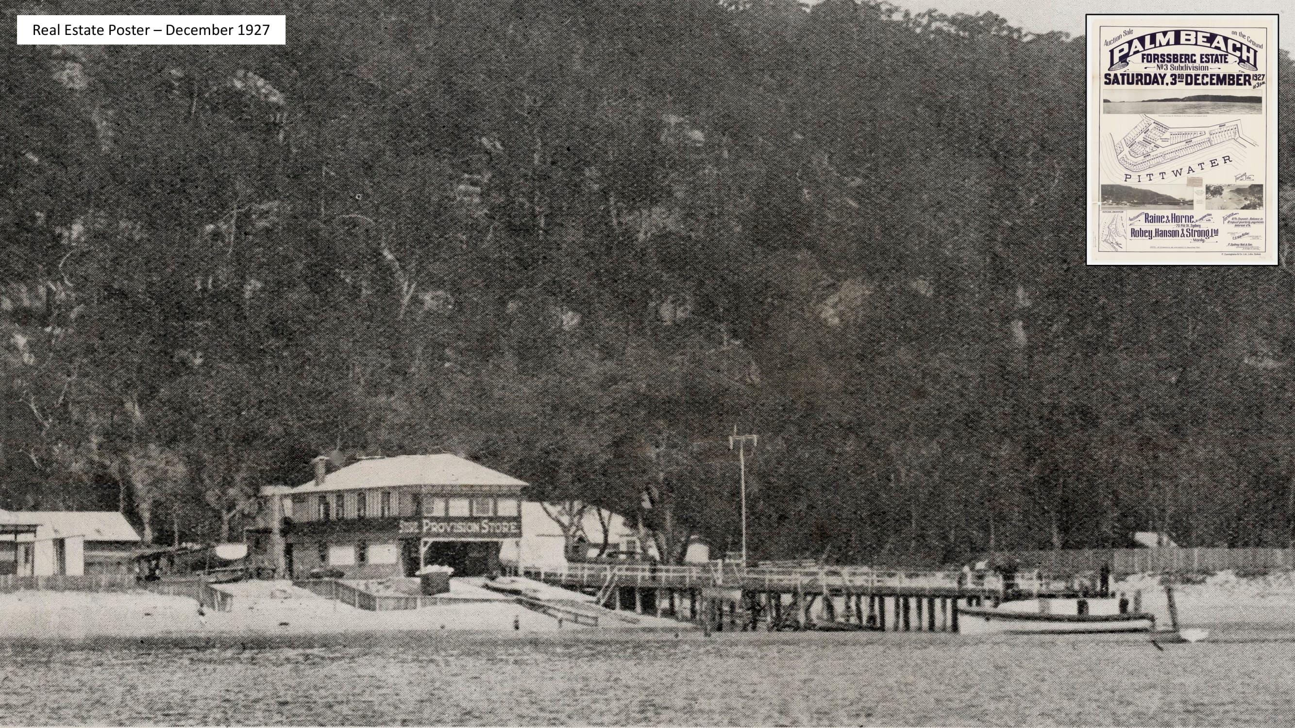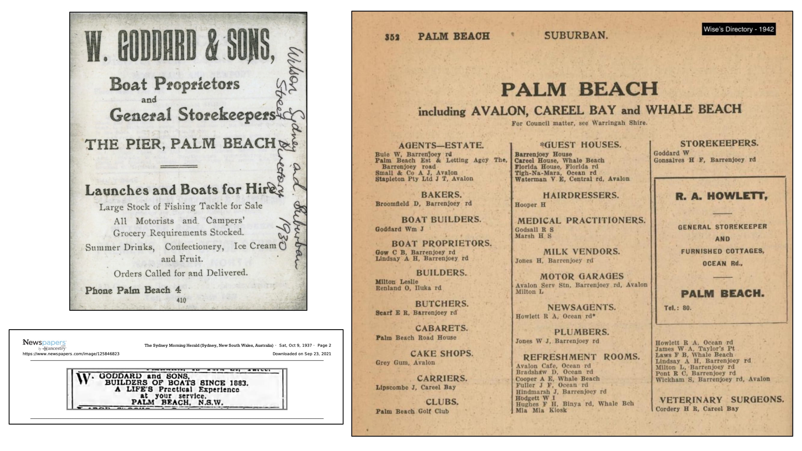 C. F. Wymark, Church Point. Pittwater. Andy Riddle, Church Point, Pittwater. Carl Gow. Palm Beach. H. Hollowoy, Palm Beach. W. Goddard and Sons, Palm Beach. Advertising. (1936, January 25). The Sydney Morning Herald(NSW : 1842 - 1954), p. 2. Retrieved from http://nla.gov.au/nla.news-article27995816