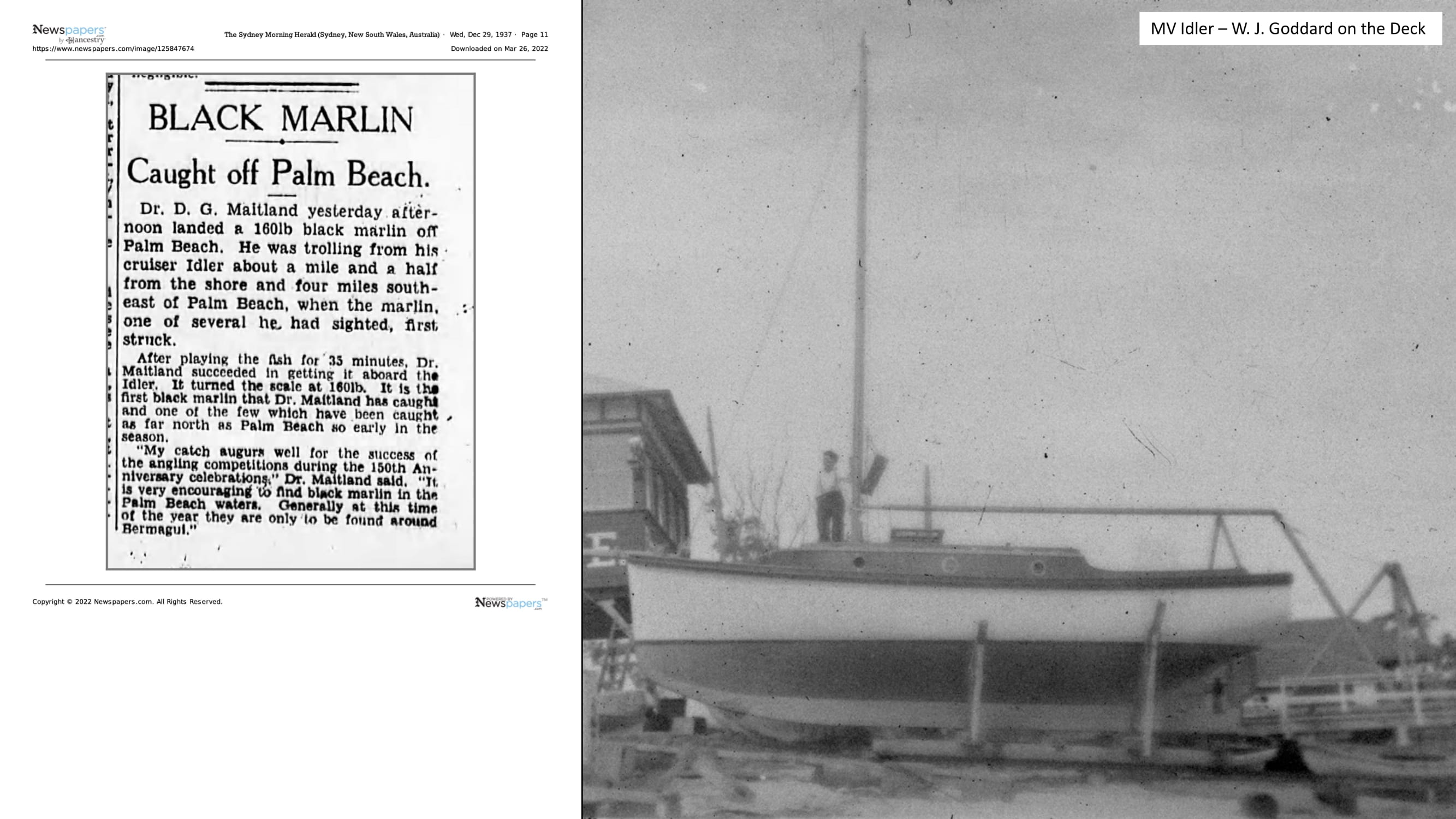 “Jimmy Goddard was a larger than life identity in the Palm Beach and Careel Bay community for 83 years. He served his apprenticeship at the family boatshed at Palm Beach with his father Arthur, the family being among the first settlers in the area. Jim was a first class tradesman and in later years restored some noteworthy vessels including the fishing boat ATALANTA which was owned by the famous American game fisherman Zane Grey who used to frequent the Palm Beach area in the 50’s.