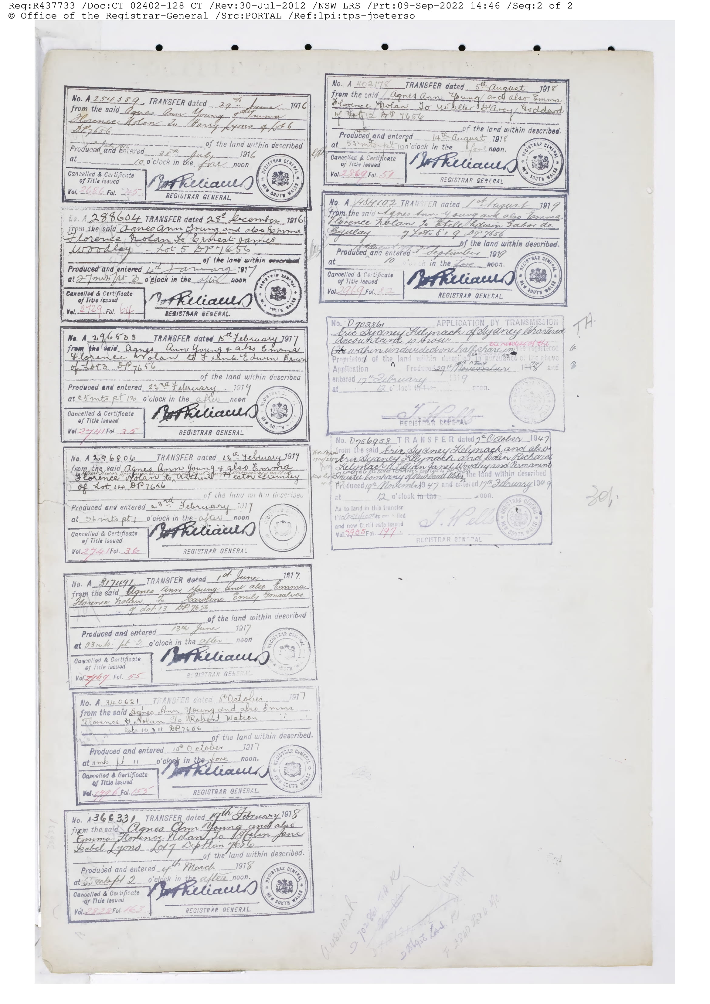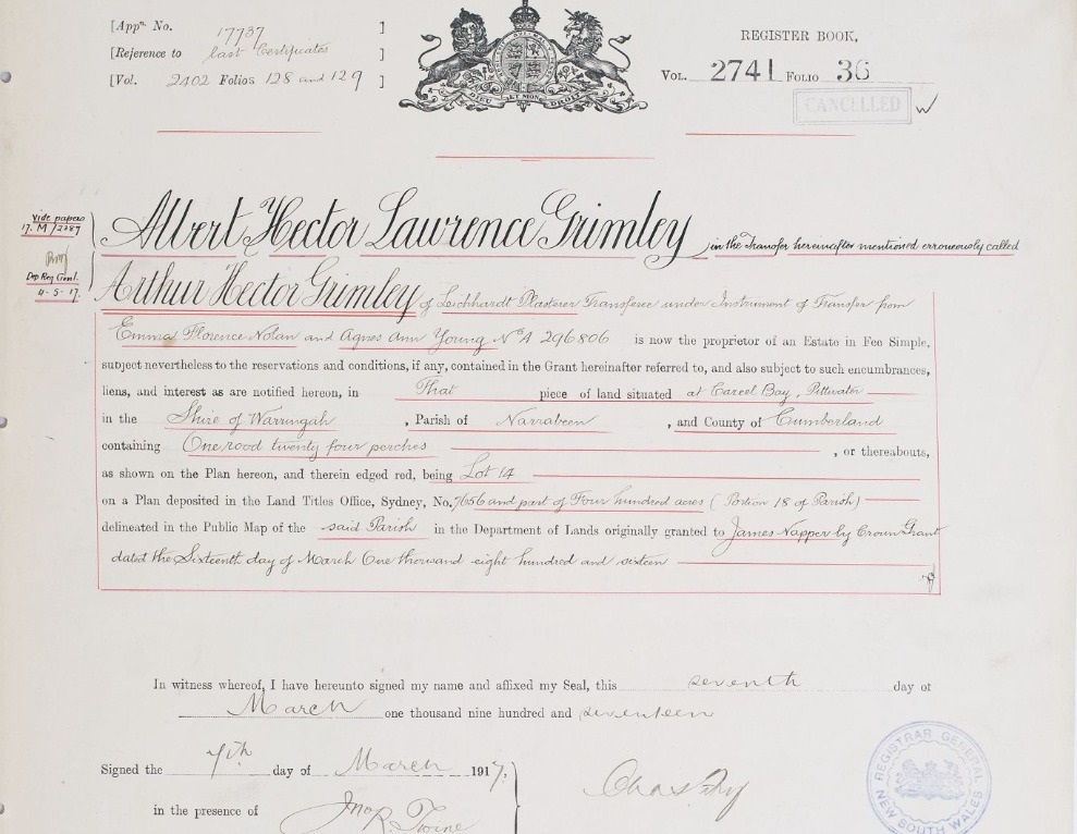 Agnes Ann Young (nee Wolstenholme) was the wife of Richard Alexander Young, who died in 1896. Their eldest surviving son was James. Emma Florence Nolan (nee Kelynack) was the wife of Herbert Russell Nolan who died in 1915. When the Barranjoey Land Company was formally registered in June 1911 the first directors were named as Harry Wolstenholme, E T Jones, John Thompson Ralston, James Young, and Herbert Russell Nolan. Many of these partners were either related, in the case of Harry Wolstenholme and James Young, or students together at Newington College.