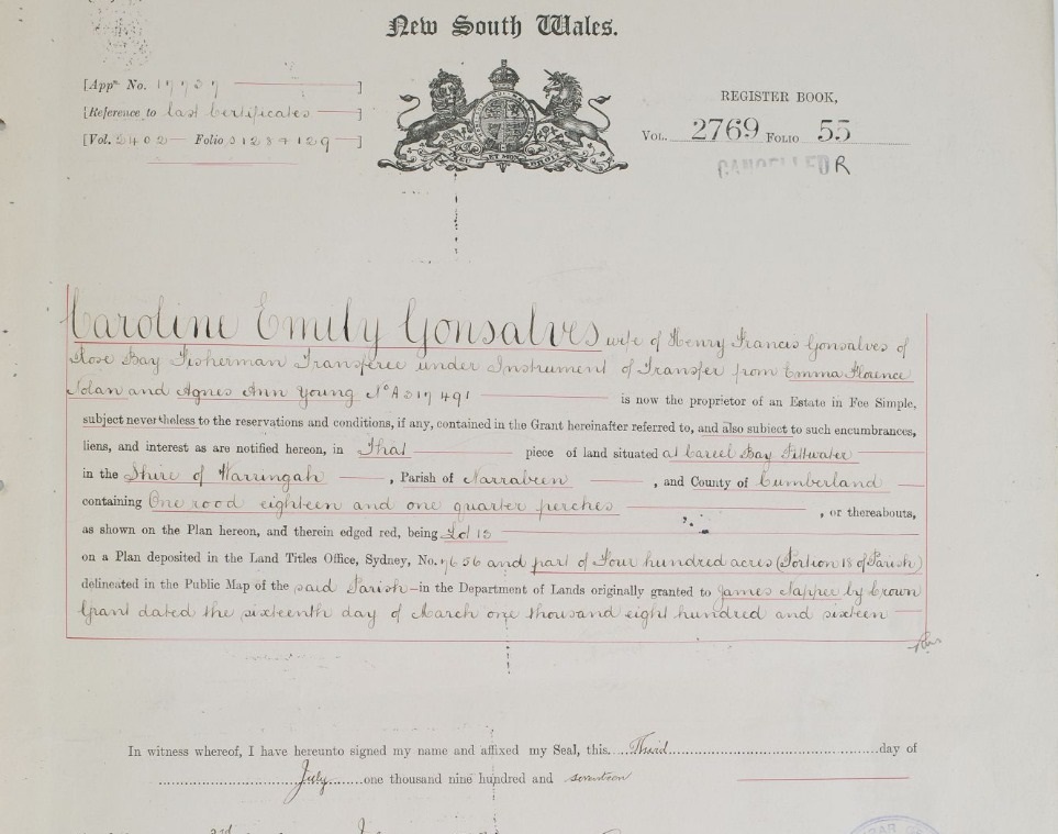 Bill's research found the original sales and that this had been placed in his son Walter's name. Interestingly, future Warringah Shire Councillor George William Hitchcock, after whom Hitchcock Park at Careel Bay is named, bought the first of his two Palm Beach lots here in 1914. Bill's research also shows the Gonsalves family lots on Waratah too: