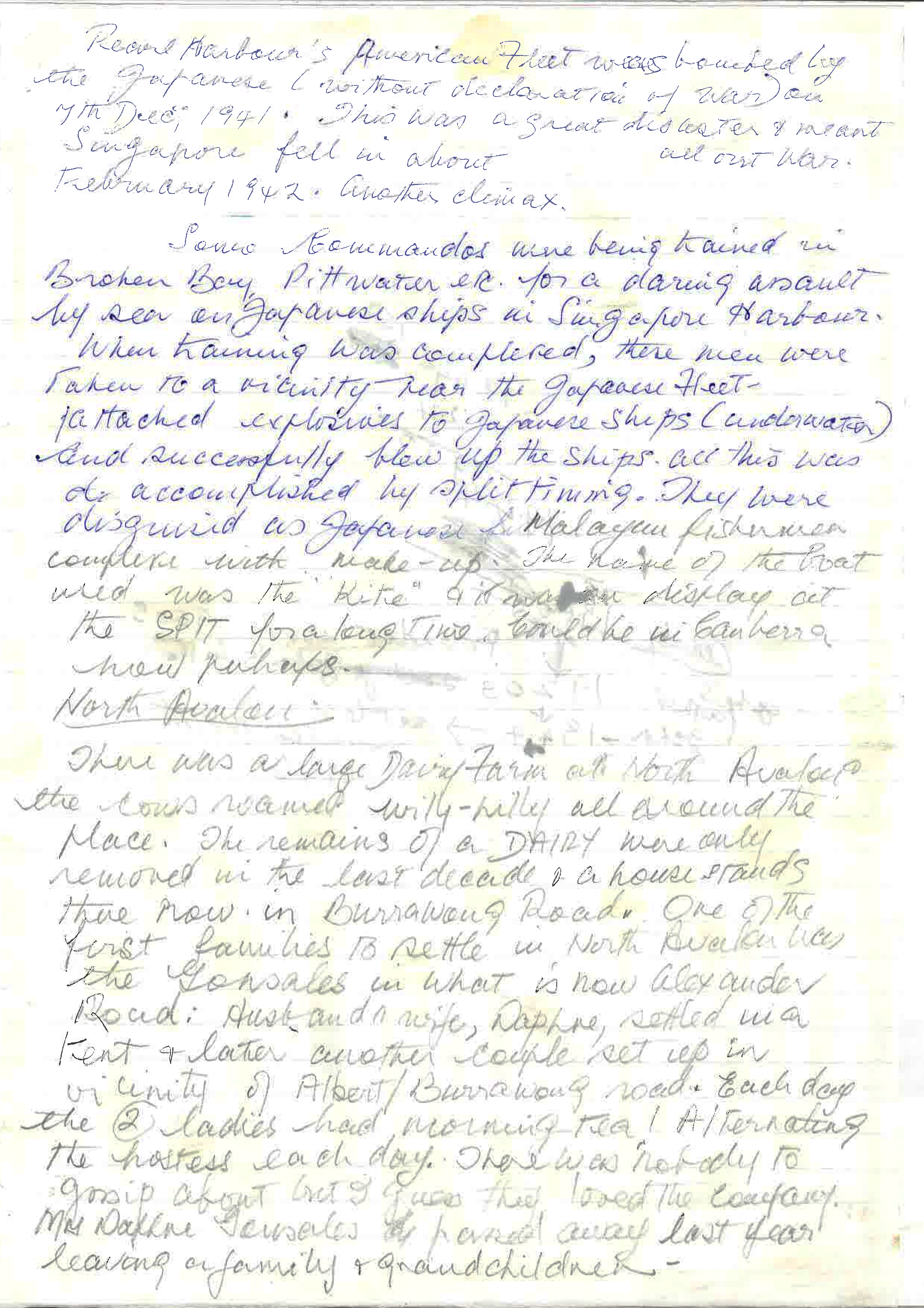 Some Commandos were being trained in Broken Bay, Pittwater etc. for a daring assault by sea on Japanese ships in Singapore Harbour. When training was completed, these men were taken to a vicinity near the Japanese Fleet & attached explosives to Japanese ships (underwater) and successfully blew up the ships. All this was accomplished by split timing.