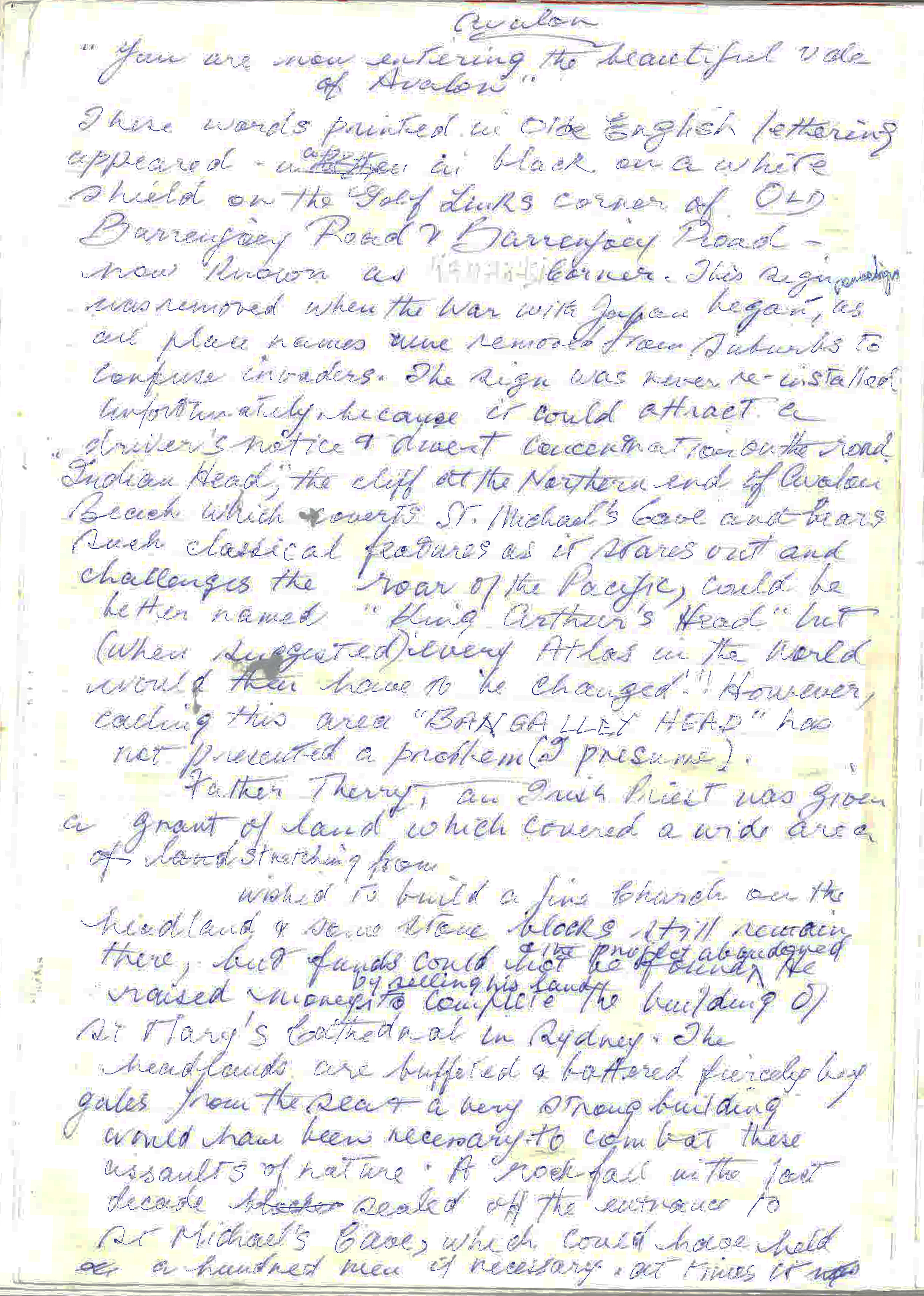 “Indian Head”, the cliff at the Northern end of Avalon Beach which covers St. Michael’s Cave and has such classical features as it stares out and challenges the roar of the Pacific, could be better named “King Arthur’s Head” but (when suggested) every Atlas in the world would then have to be changed!!! However, calling this area “BANGALLEY HEAD” has not presented a problem (I presume).