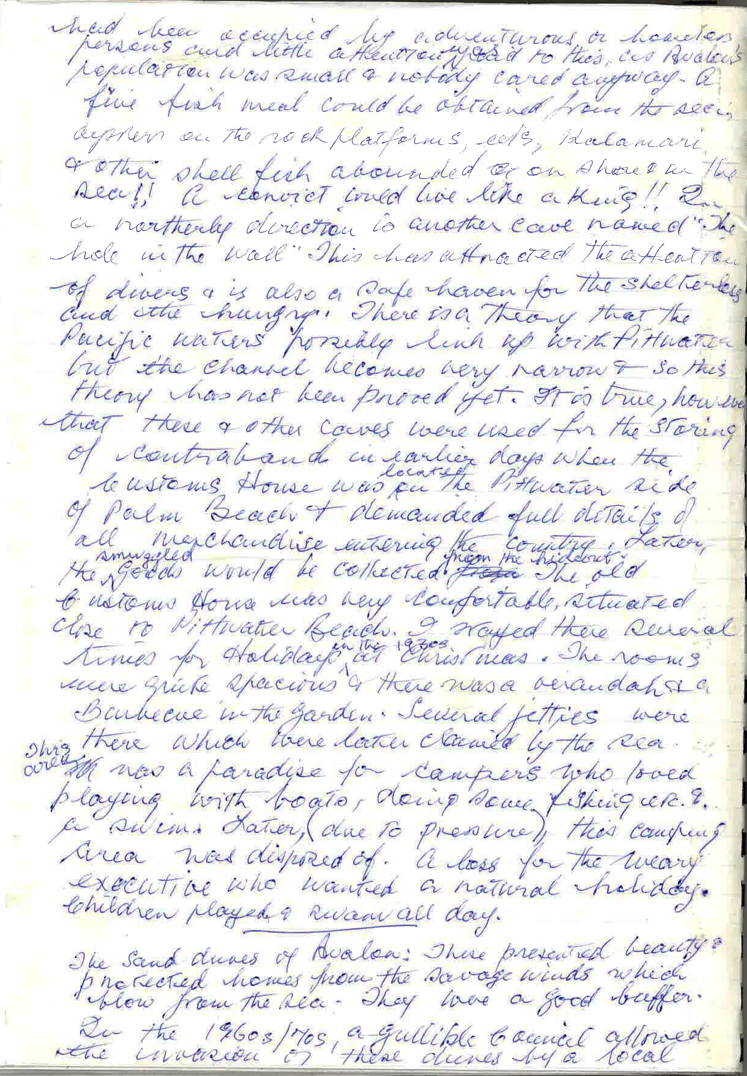 In a northerly direction is another cave named “The Ovens”. This has attracted the attention of divers and is also a safe haven for the shelterless and the hungry. There is a theory that the Pacific waters (might) link up with Pittwater but the channel becomes very narrow and so this theory has not been proved yet. It is true, however that these and other caves were used for the storing of contraband in earlier days when the Customs House was located on the Pittwater side of Palm Beach and demanded full details of all merchandise entering the country. Later the smuggled goods would be collected from the hideout.