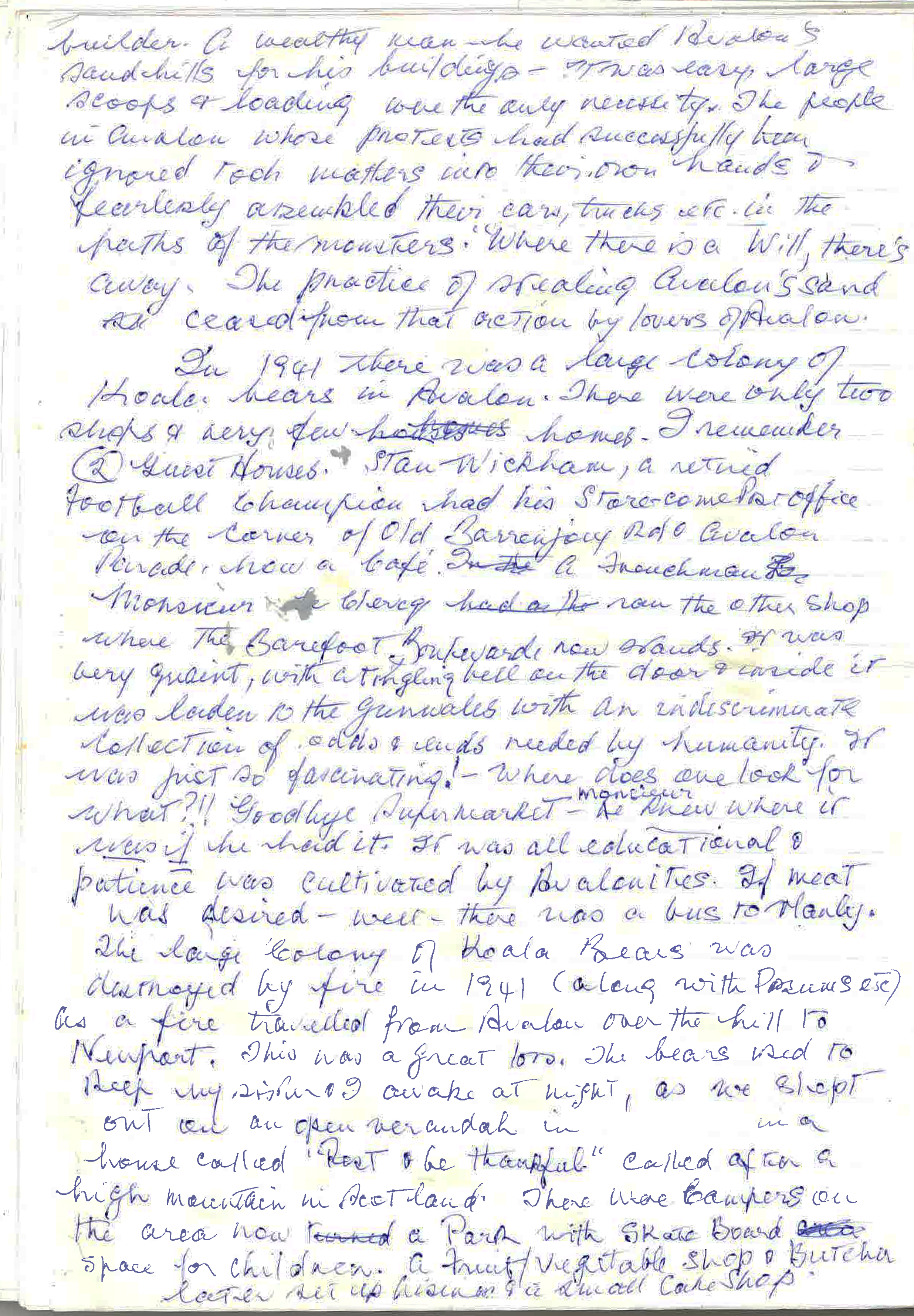 The large colony of Koala bears was destroyed by fire in 1941 (along with possums etc.). As a fire travelled from Avalon over the hill to Newport. This was a great loss. The bears used to keep my sister and I awake at night, as we slept out on an open verandah in a house called “Rest & be thankful” – called after a mountain in -----.