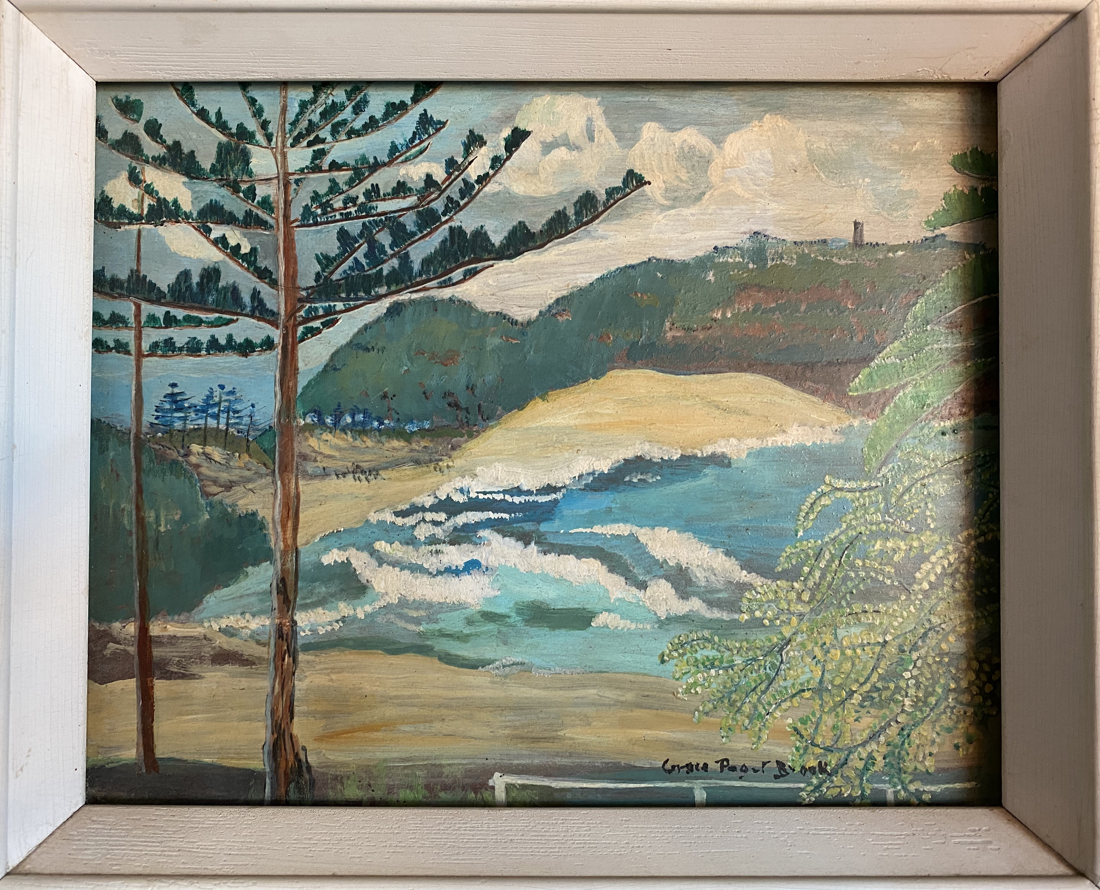 This was a Manly Art Galley Award winner in 1964, and shows Bungan Castle surrounded by thick vegetation. I think this painting is related to a miniature reproduction of a larger Bungan Beach painting Grace completed below.