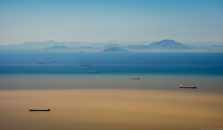 The two major threats to the Great Barrier Reef are anthropogenic climate change and agricultural runoff from land. The photo shows dozens of ships anchored near the Hay Point coal terminal, and a muddy flood plume from the Pioneer River - such plumes carry pollutants onto the inner Great Barrier Reef. Matt Curnock