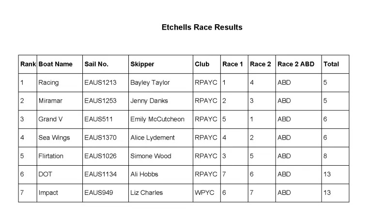 - 2024: A competitive fleet of eight Etchells took to the water, with Elaine Fowler (Phoenix) claiming victory, followed by Jenny Danks (Flirtation) and Pru Bennett (Miramar).