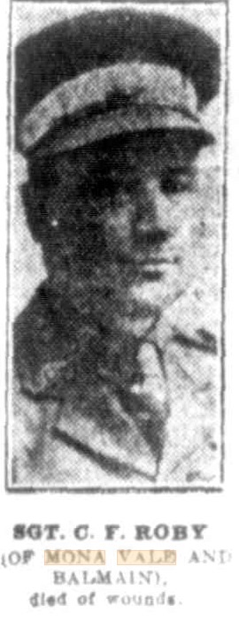 SGT. C. F. ROBY (OF MONA VALE AND BALMAIN), died of wounds. N.S.W. HONOR ROLL. (1918, October 7). Evening News (Sydney, NSW : 1869 - 1931), p. 4. Retrieved, from http://nla.gov.au/nla.news-article114271969