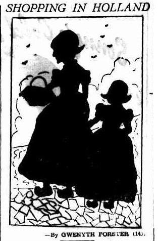 Left: SECTION FOR GIRLS AND BOYS Conducted by SOUTH WEST WIND. SHOPPING IN HOLLAND -By GWENYTH FORSTER (14). SECTION FOR GIRLS AND BOYS. (1939, June 5). The Sydney Morning Herald (NSW : 1842 - 1954), p. 23 Supplement: Women. Retrieved from http://nla.gov.au/nla.news-article27973270
