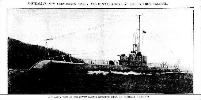 AUSTRALIA'S NEW SUBMARINES, OXLEY AND OTWAY, ARRIVE AT SYDNEY FROM ENGLAND. A STRIKING VIEW OF THE OTWAY PASSING BRADLEY'S HEAD AT NIGHTFALL YESTERDAY. AUSTRALIA'S NEW SUBMARINES, OXLEY AND OTWAY, ARRIVE AT SYDNEY FROM ENGLAND. (1929, February 15).The Sydney Morning Herald (NSW : 1842 - 1954), p. 16. Retrieved from http://nla.gov.au/nla.news-article16531518