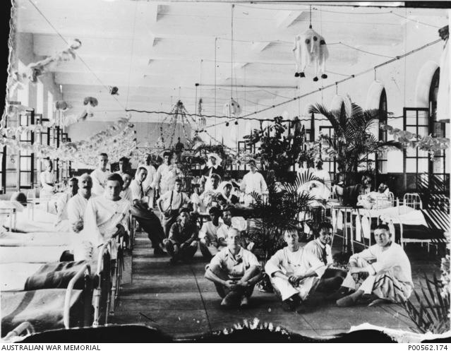 Bombay, India. 1916-12-25. Patients and staff in one of the wards of the Victoria War Hospital decorated with Christmas decorations. The hospital was staffed by members of the Australian Army Nursing Service (AANS) whose patients included members of the Mesopotamian Expeditionary Force and captured Turkish prisoners. On the day this photograph was taken new eighty surgical cases arrived at the hospital.