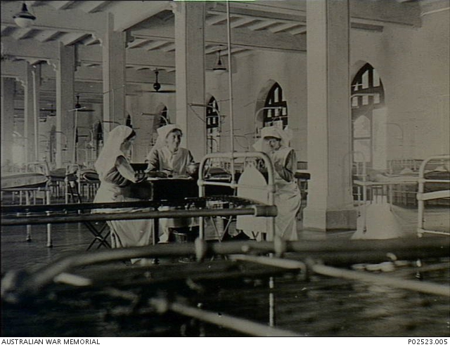Bombay, India. c 1917. Three members of the Australian Army Nursing Service (AANS) sitting at a table in a ward at Victoria War Hospital (situated in a new railway office building close to the docks). On the left is Staff Nurse (S/Nurse) Edith Maud Philp, who was one of a contingent of one hundred nurses requested to work in British War Hospital in Bombay. S/Nurse Philp, who trained at Caulfield Hospital, travelled to Bombay on the Canberra. She worked at the Victoria War Hospital, a hospital with two hundred beds on each of the first three floors and Sister's quarters on the fourth. This hospital received the most serious cases as it was five minutes from the dock. Patients were received from Mesopotamia, and they included British Prisoners of War (POWs) released by the Turks, Turkish prisoners and British troops. At one stage British troops suffering from heatstroke were received at one thousand a week. (Donor E. Pearce)